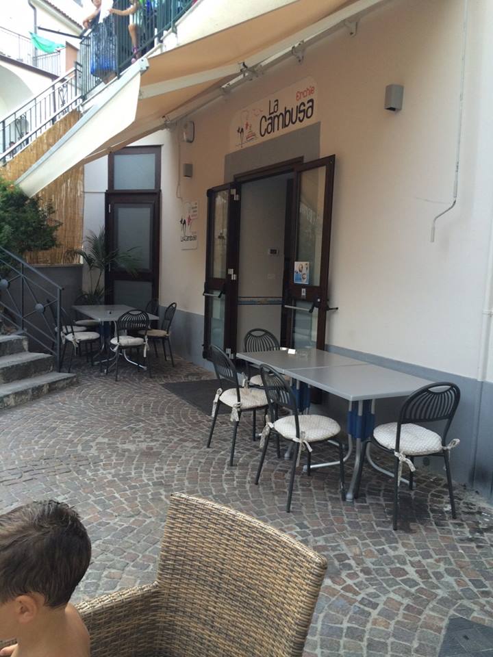 Oggi la Cambusa sorge sulla struttura che portava il nome “Da Federico”, completamente rinnovata, con un restyling di gusto nautico. Presenta una saletta interna, un’area bar e uno spazio esterno, adibito ad aperitivi e consumazioni estive. Il cortese personale di sala è subito pronto ad accogliere gli ospiti e a dare consigli circa il menù. La prenotazione qui è consigliata e si ha la possibilità sia di pranzare sia di cenare.