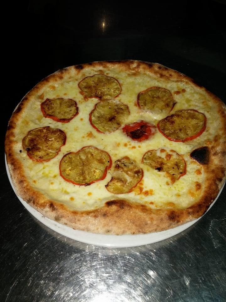Impastare la farina con il lievito sciolto in acqua tiepida, il cucchiaino d’olio e il sale, diluito precedentemente. Ottenere un composto sodo ed omogeneo, e dividerlo in quattro panetti uguali. Metterli a lievitare coperti da un canovaccio asciutto, in un luogo tiepido, per almeno due ore fino a quando non avranno raddoppiato il loro volume. Dopodiché infarinare leggermente una spianatoia di marmo e stendere con le mani la pizza, dandole la classica forma arrotondata. Sul disco disporre i latticini tagliati a pezzetti, le rondelle di melanzana fritta e ben tamponata e un bel giro d’olio. La cottura dovrà avvenire ad una temperatura di 400 gradi per 1 minuto e 30 secondi circa, rigirandola e controllando che non bruci. Una volta sfornata a piacere decorare con basilico fresco e una generosa spolverata di grana grattugiato.