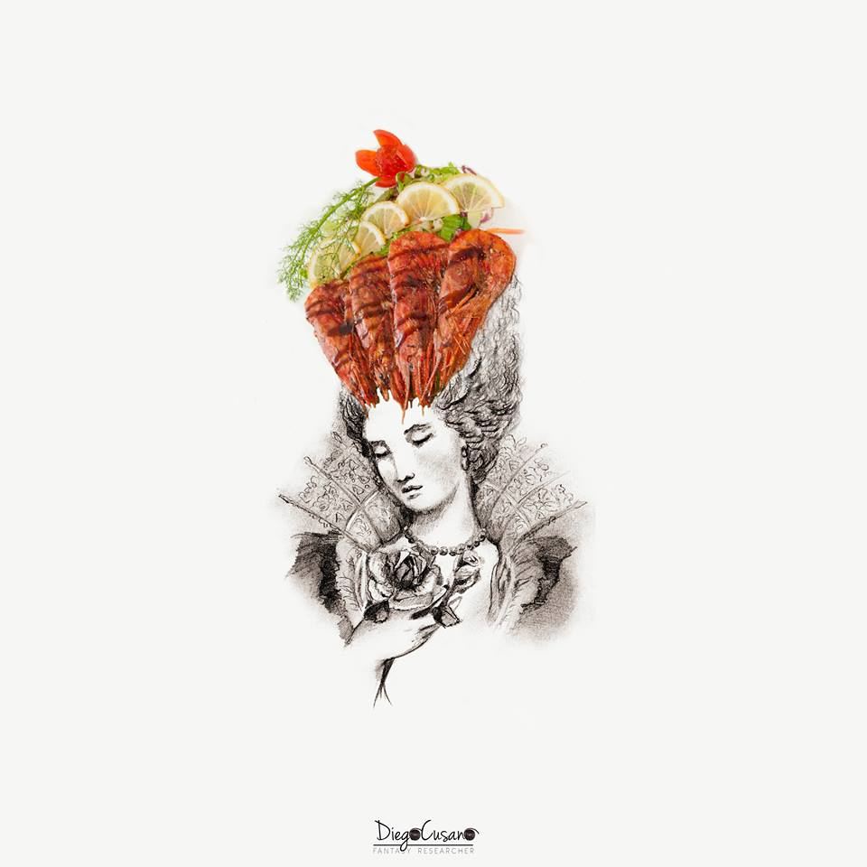 A seguire una bella carrellata di alcune delle opere che mescolano Grafica e Gastronomia, dove ritratti di dame sono accompagnati dalle più svariate pietanze, sistemate a mo’ di simpatici cappelli o abitini!