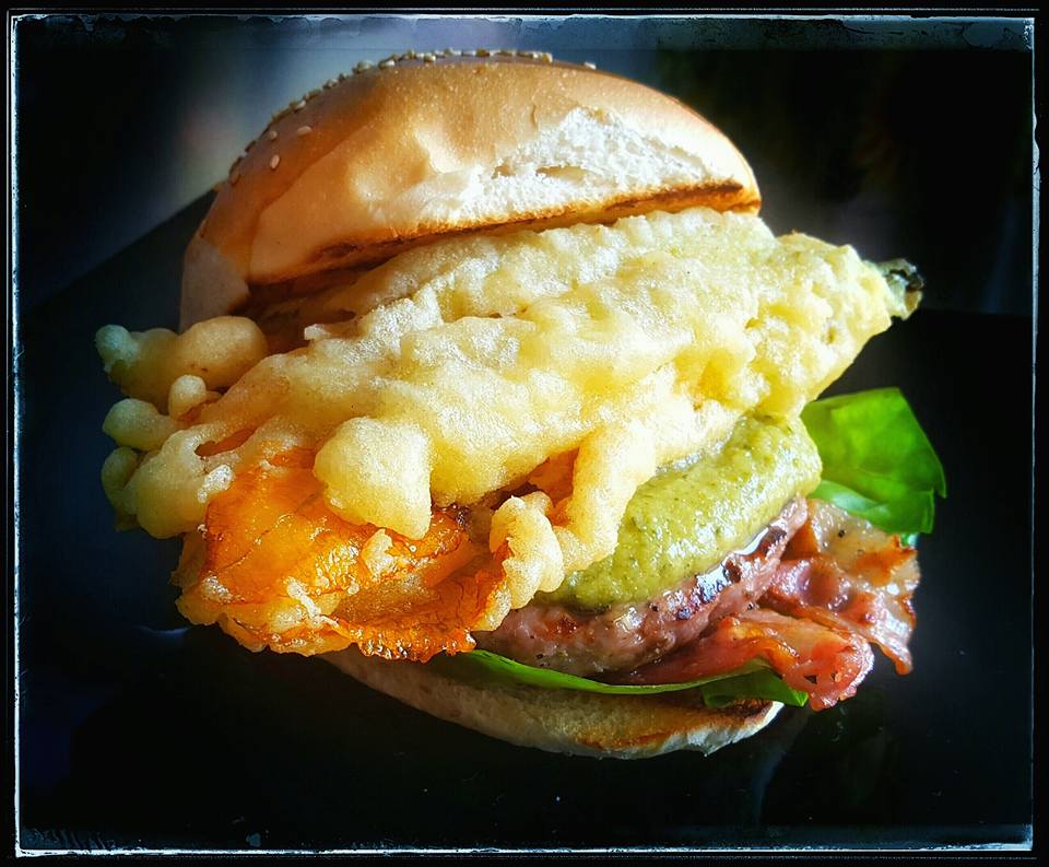 Pangurmè è un locale ormai conosciutissimo da chi scrive ed il link vi rimanda alla recensione, se siete curiosi di saperne di più. Qui si intende segnalare una gran bella novità dello chef Antonello Martuscelli, gestore del locale, un capolavoro quasi artistico oserei dire, per quanto sono belle le sue forme ed i suoi colori. Sto parlando di “Pangurmè Fiore” costituito da bun artigianale al sesamo (ricetta segreta dello chef) con hamburger nelle varianti di salsiccia, manzo o pollo, crema di zucchine, bacon, lattuga e uno strabordante fiore di zucca in pastella, ripieno di ricotta di bufala. Mamma mia aiuto, ossigeno!