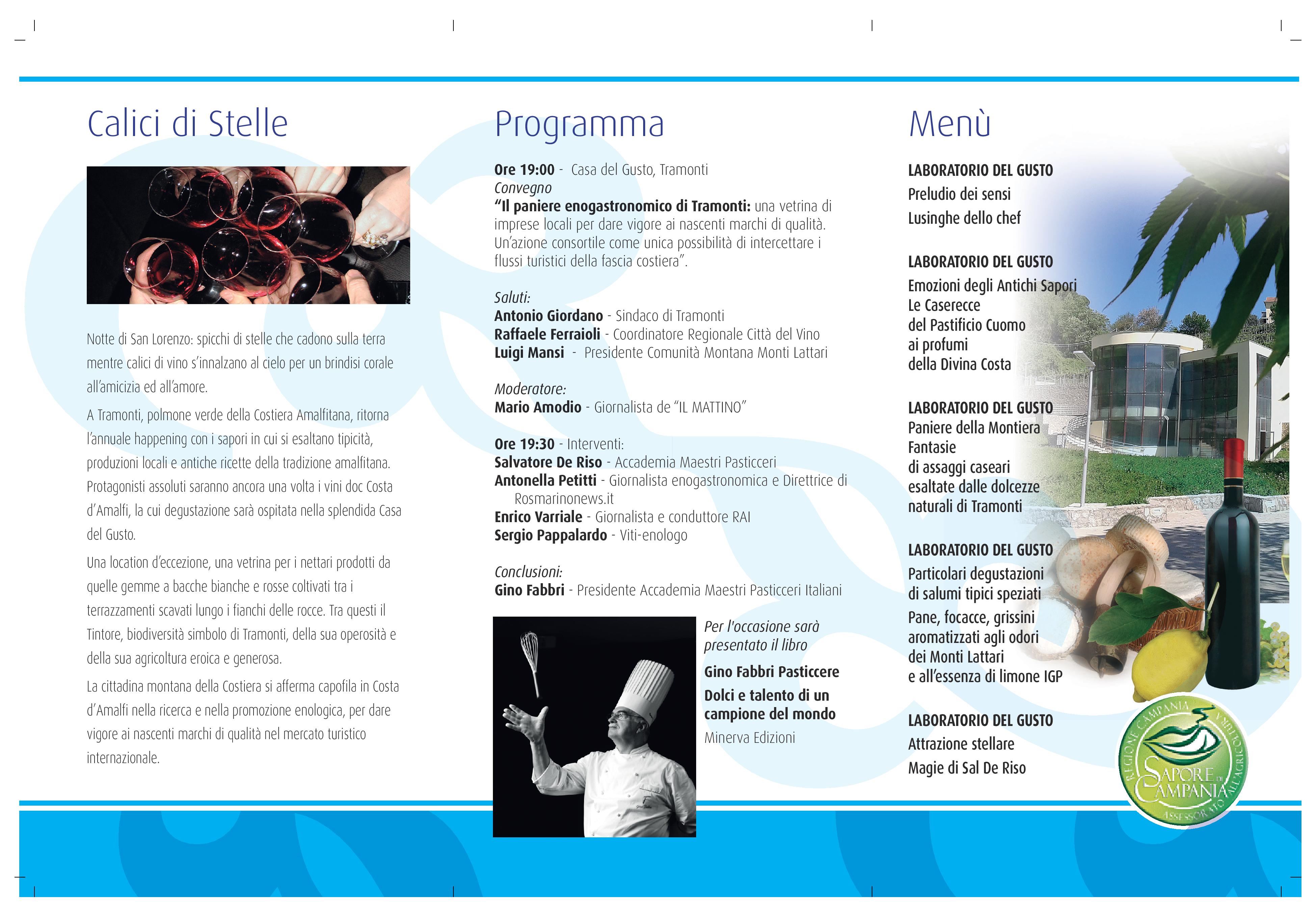 Tra gli ospiti illustri: Raffaele Ferraioli – Coordinatore Regionale Città del Vino, Salvatore De Riso – Accademia Maestri Pasticceri, Luigi Mansi – Presidente Comunità Montana Monti Lattari, Enrico Varriale – Giornalista e Conduttore Rai, Antonella Petitti – Giornalista enogastronomica e Direttrice di Rosmarinonews.it, Sergio Pappalardo – Viti-enologo. A moderare l’incontro il giornalista de “Il Mattino” Mario Amodio. Accoglierà e saluterà gli ospiti il Sindaco di Tramonti dott. Antonio Giordano, mentre le conclusioni saranno affidate al Presidente dell’Accademia Maestri Pasticceri Italiani Gino Fabbri, che per l’occasione presenterà il libro “Gino Fabbri Pasticcere – Dolci e talento di un campione del mondo”. Dopo 18 anni torna in Italia il titolo più ambito della pasticceria internazionale: il team Italia si aggiudica la medaglia d’oro nella finale della Coupe du Monde de la Patisserie.