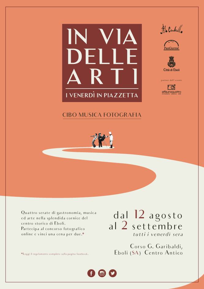 EBOLI. Gastronomia ispirata al territorio, musica e fotografia: saranno questi gli ingredienti de “In Via delle Arti: i venerdì in piazzetta”, la rassegna che prenderà il via dopodomani, venerdì 12 agosto alle ore 21.30, nella suggestiva piazzetta situata lungo corso Garibaldi, arteria principale del centro storico ebolitano, ribattezzata Via delle Arti. Ad organizzarla, due realtà che a corso Garibaldi sono “di casa”: l’associazione Al Ciauliello- laboratorio di cucina artigianale e la panineria gourmet PanGurmè, in collaborazione con Effeunoquattro Fotografia.