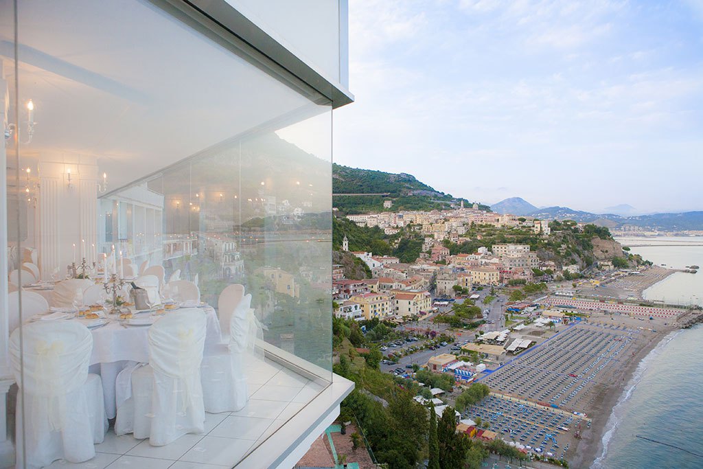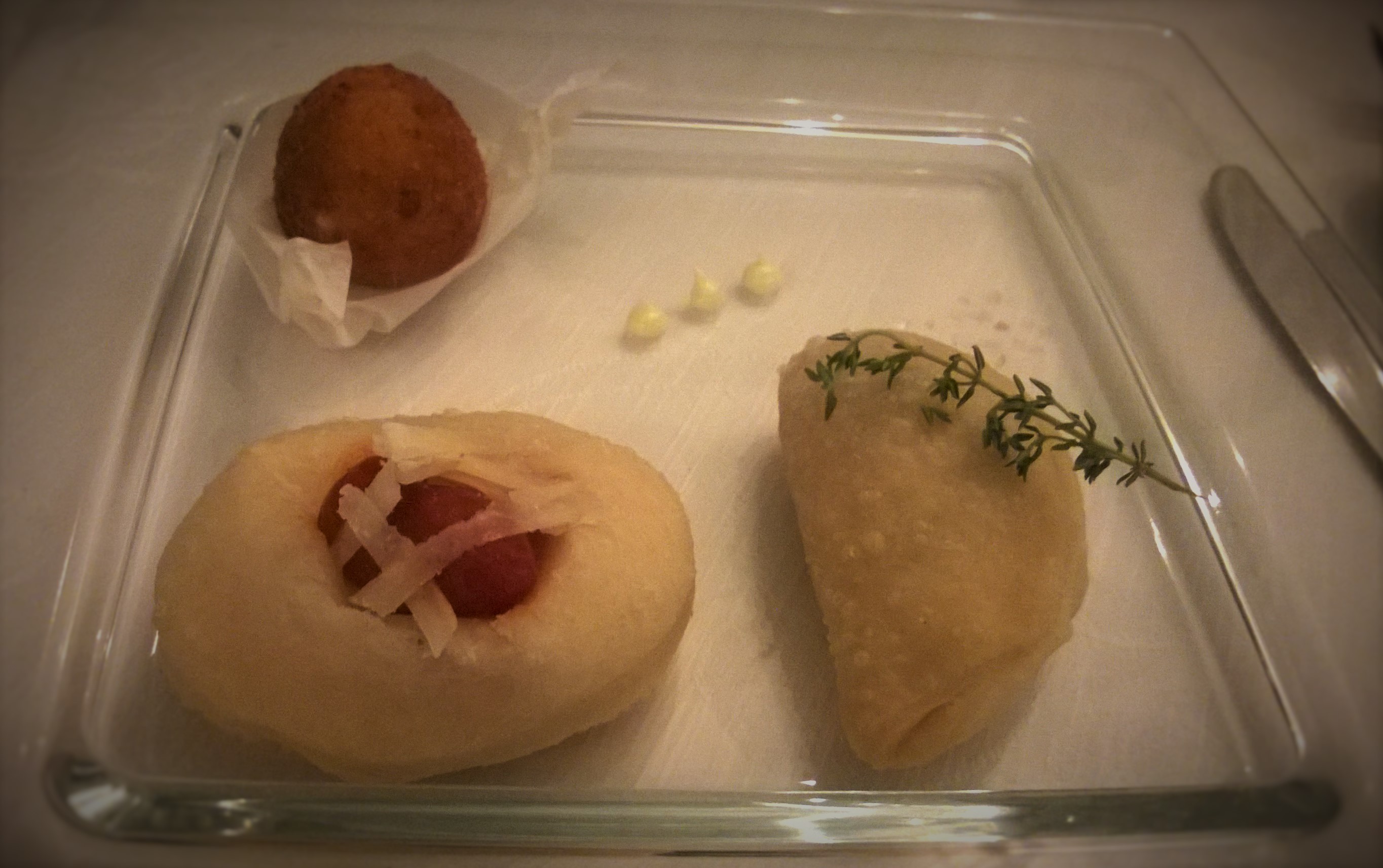 I piatti di Gianpaolo si sono presentati al palato e alla vista freschi e dinamici proprio come lui, che è determinato a fondere la tradizione con l’innovazione, conservando uno stile personale e già ben definito. Esteticamente ben presentate le varie portate dall’antipasto al dolce, mi hanno subito fornito degli spunti artistici e non ho potuto fare a meno di pensare alle opere degli artisti del passato, grazie anche ai giochi di colori e forme che si avvicendavano nei piatti. Tutto è stato esaltato dalla cornice naturale che si proiettava dinnanzi a me dall’ampia vetrata trasparente del ristorante, da quella marina di Vietri che ti affascina e che rapisce i sensi, come d’altronde ogni angolo della Costiera Amalfitana. Prima del pasto mi sono deliziata intingendo nell’olio i pani preparati dallo chef, in particolare quello al miele e limone, definirlo sublime è dir poco e mi sono divertita a spezzettare lunghi grissini allo strutto, indimenticabili. E’ arrivato quindi il momento di cenare pasteggiando il rosato Selva delle Monache della casa vinicola Ettore Sammarco di Ravello.