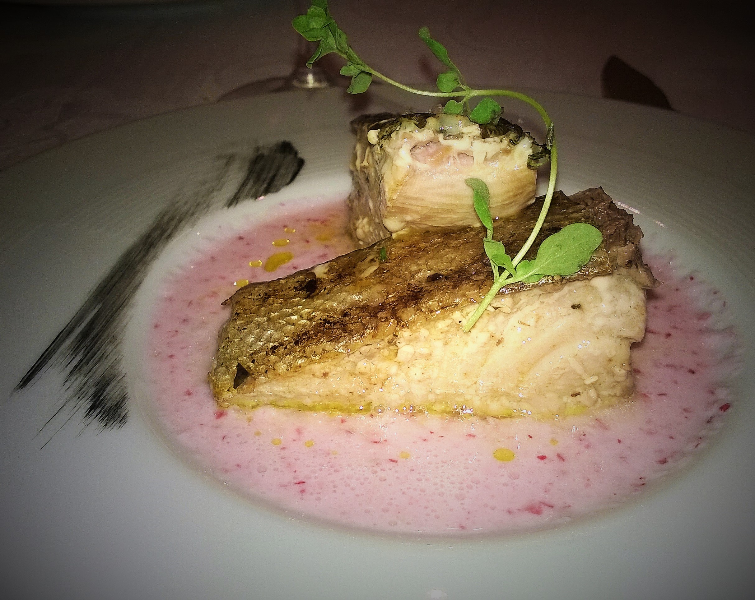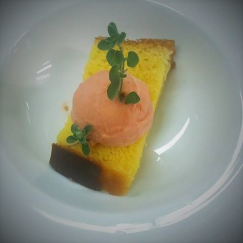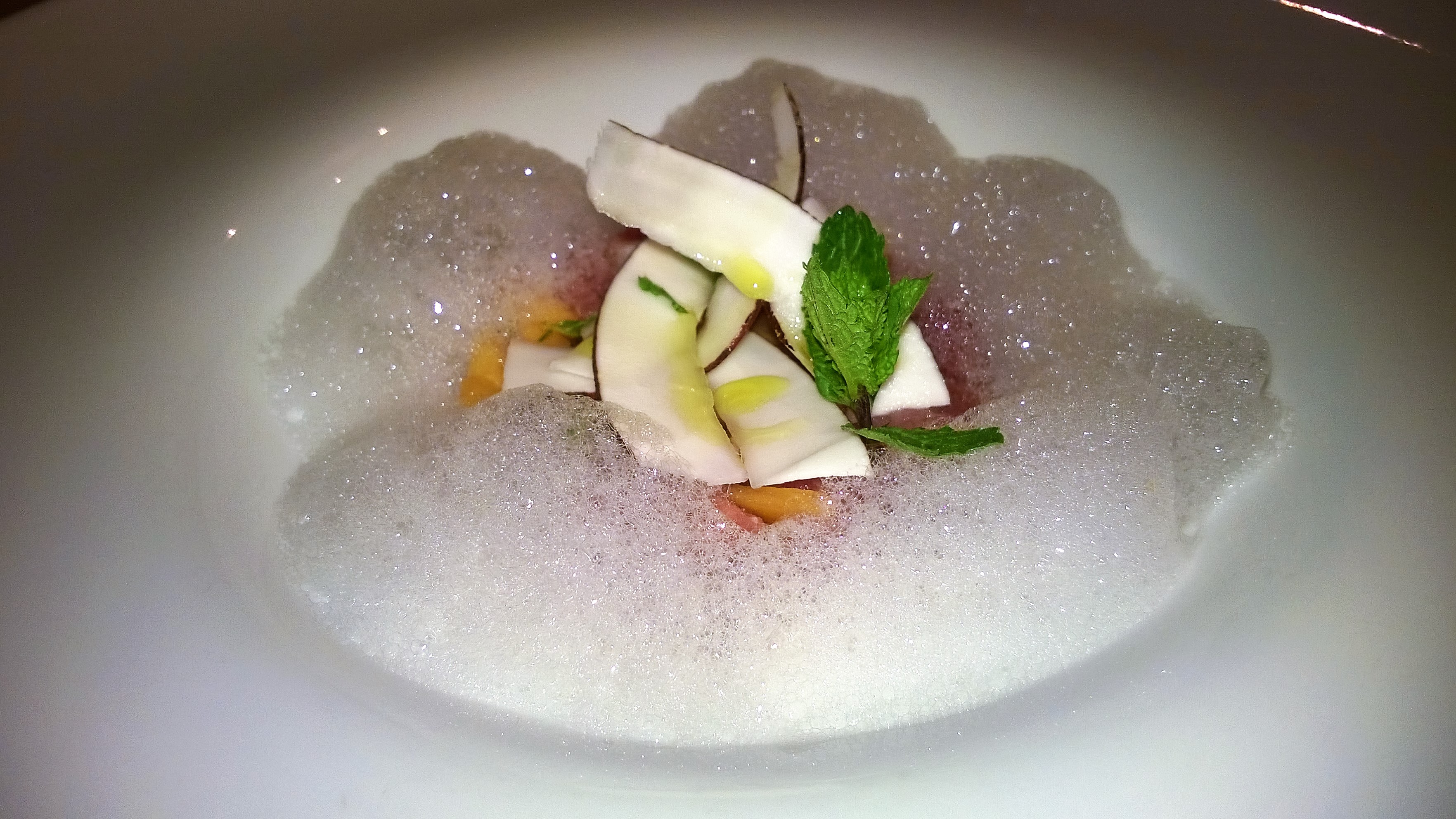 Ben architettata la tartare di tonno rosso, melone, cocco e aria alla Vodka. Esplosiva, frizzante, tropicale. Mi ha fatto pensare ad un quadro di Eduard Manet dal cromatismo appunto fresco e luminoso, meglio noto con il titolo di “Natura morta con pesci e ostriche” del 1864.
