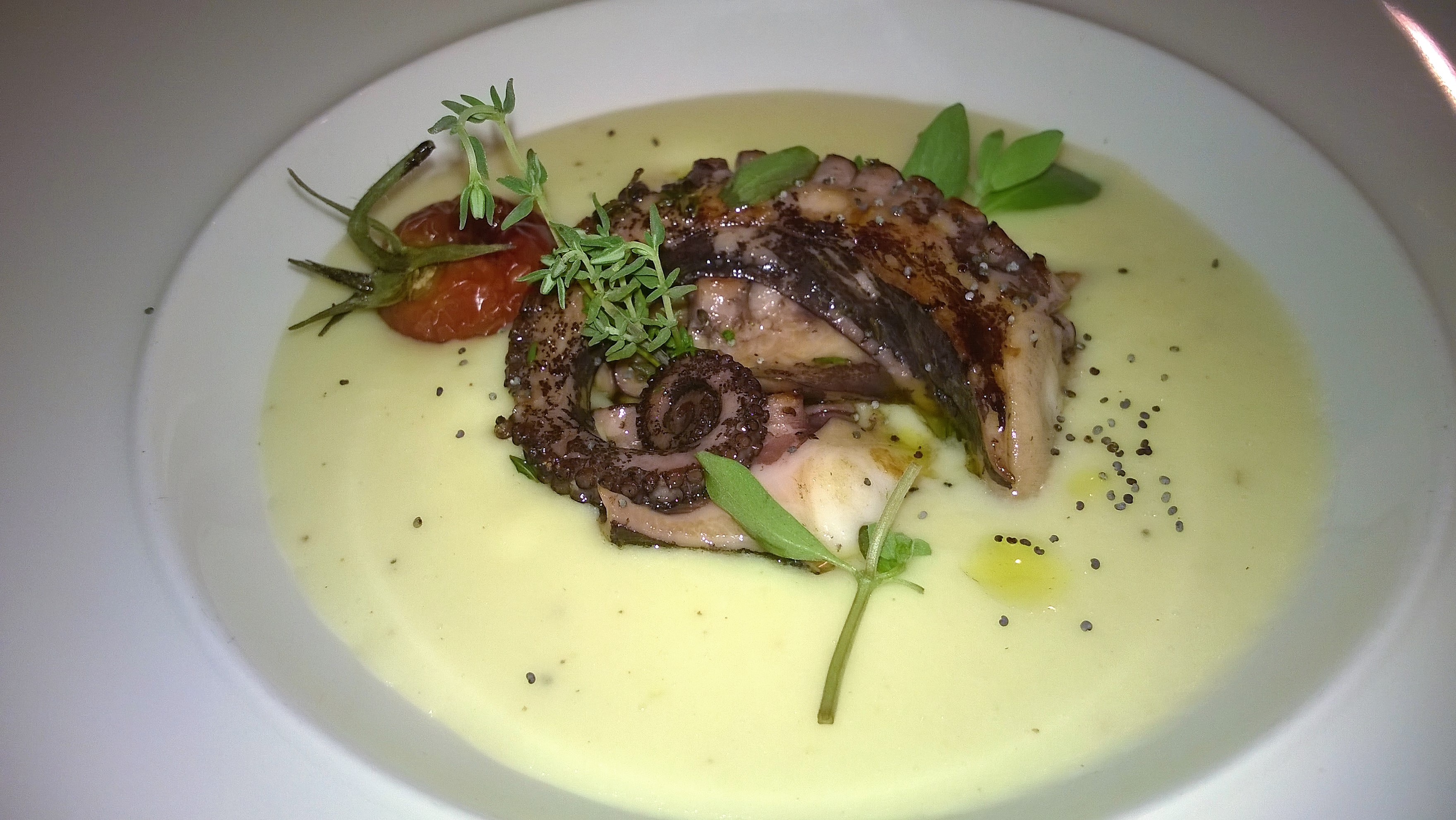 A seguire la raffinata delicatezza del polpo scottato su crema di patate.