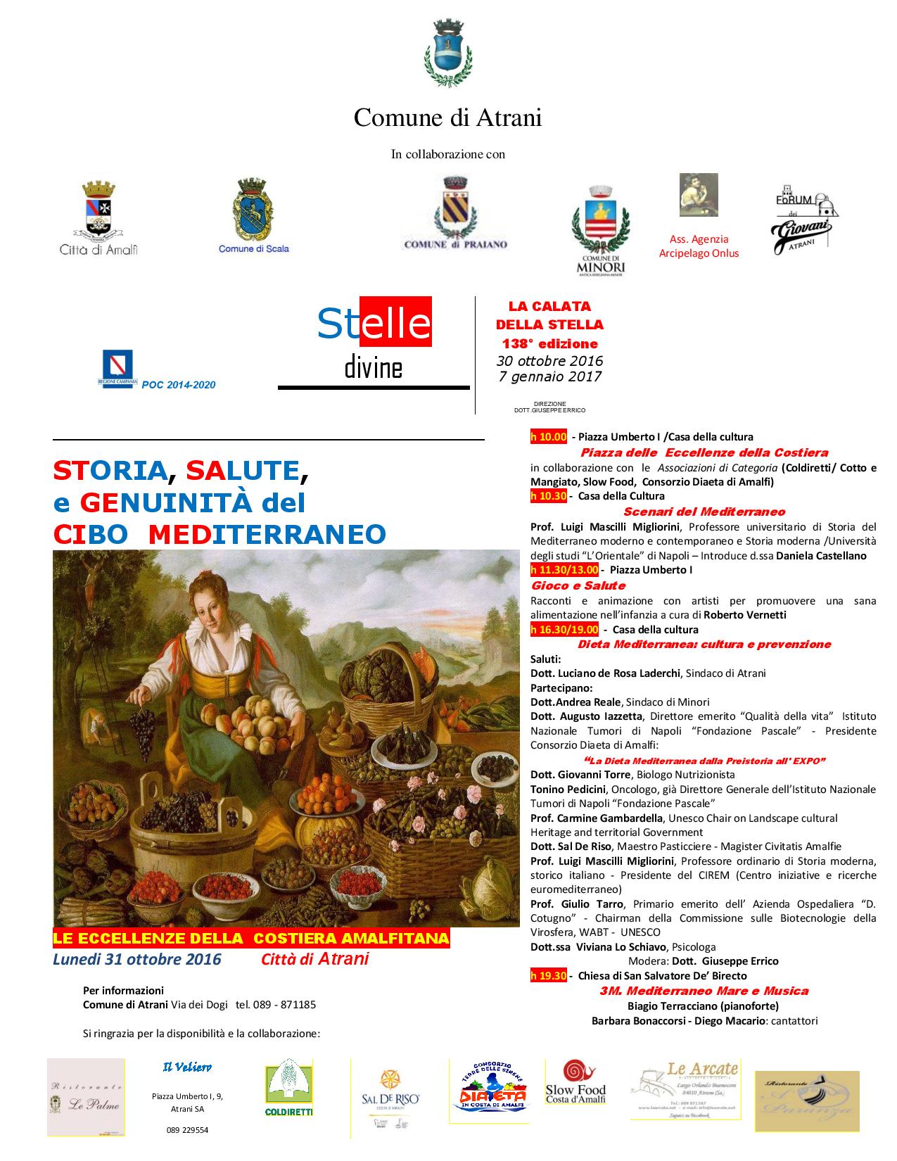 Un festival innovativo e sociale dedicato al Mediterraneo (per quest’anno i temi sono le fiabe, la dieta mediterranea, le leggende) e alle sue peculiarità culinarie; uno dei borghi più belli d’Italia e le sue straordinarie tradizioni ultrasecolari; grandi personaggi internazionali del mondo della cultura, della ricerca, della medicina e della buona tavola. Sono questi gli ingredienti di “Stelle Divine” in programma dal 30 ottobre 2016 al 7 gennaio 2017 nella straordinaria location di Atrani (Salerno). La rassegna, realizzata dal Comune di Atrani in collaborazione con i Comuni di Amalfi, Minori, Scala e Praiano, in partenariato con l’associazione Agenzia Arcipelago Onlus e il Forum dei Giovani rientra nella linea strategica