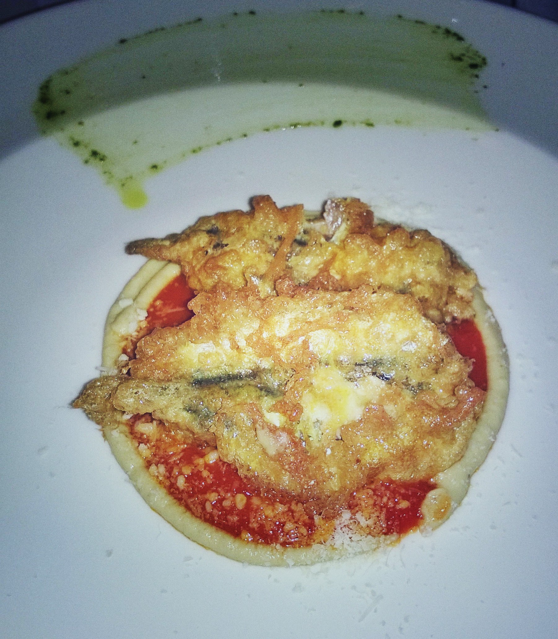 Le alici in questo caso sono state prima fritte, dopo imbottite con provola e ricotta, poi assemblate su una base di sugo di pomodoro e cremoso alla melanzana, infine spolverizzate abbondantemente di parmigiano di latte di bufala. Croccante e leggero il fritto, le alici da sempre si abbinano in maniera perfetta ai latticini, in un accostamento riuscitissimo.