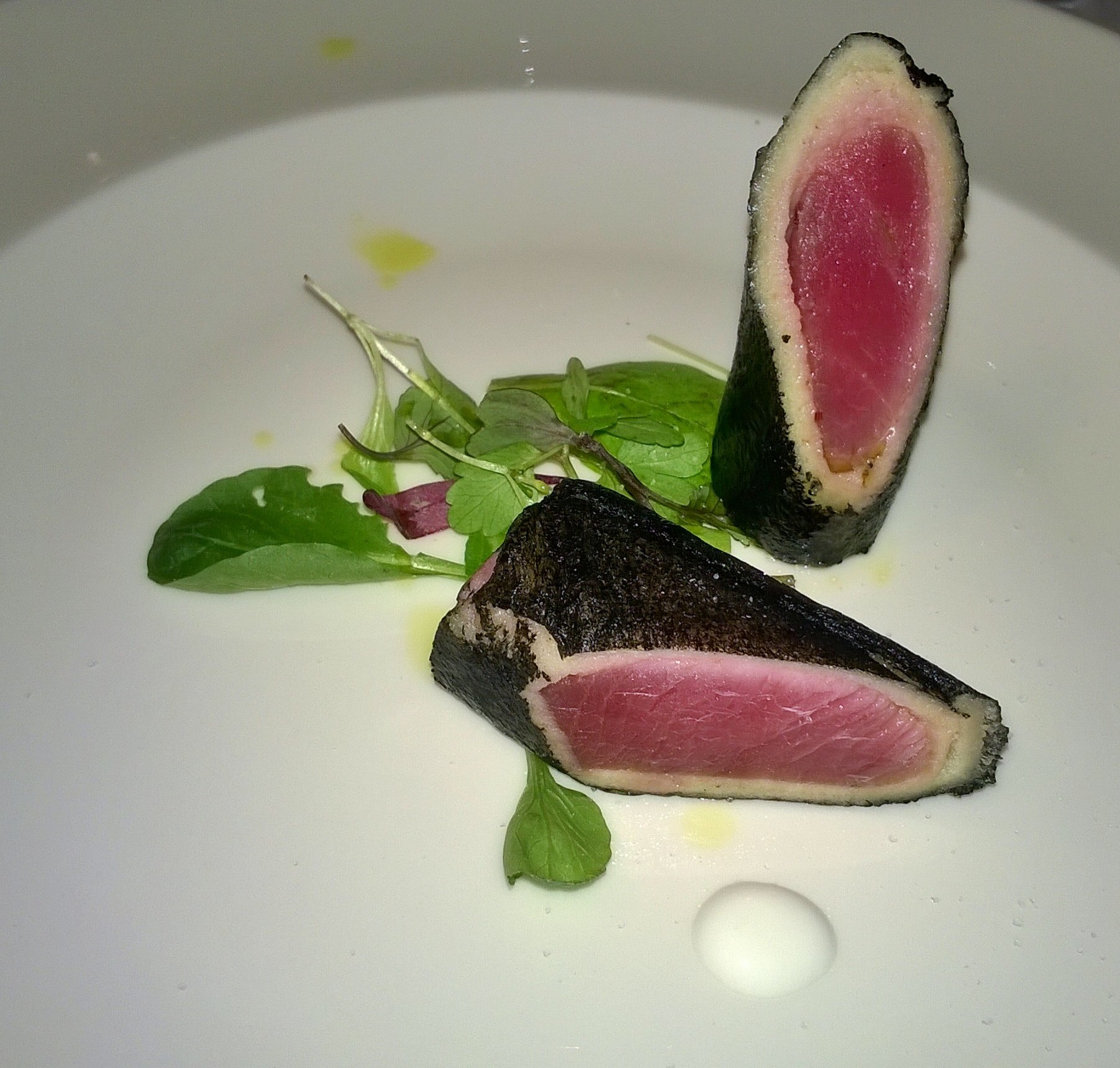 Un piatto innovativo ma che non ha voluto abbandonare la tradizione, anche nell’italianità del titolo. Un sushi alla “salernitana” secondo Domenico che ha utilizzato come involucro esterno per il cubotto di tonno del pan tramezzino reso sottilissimo dalla sfogliatrice, spennellato con del nero di seppia, per dare l’idea dell’alga nori. Infine il tonno marinato nel succo di mandarino ha costituito il ripieno del “sciù sci”, aromatizzato con chicchi interi di pepe rosa e adagiato su misticanza con pois di panna acida. Mediterraneità, sapori fusion giapponesi e dell’est Europa in questa creazione davvero originale.