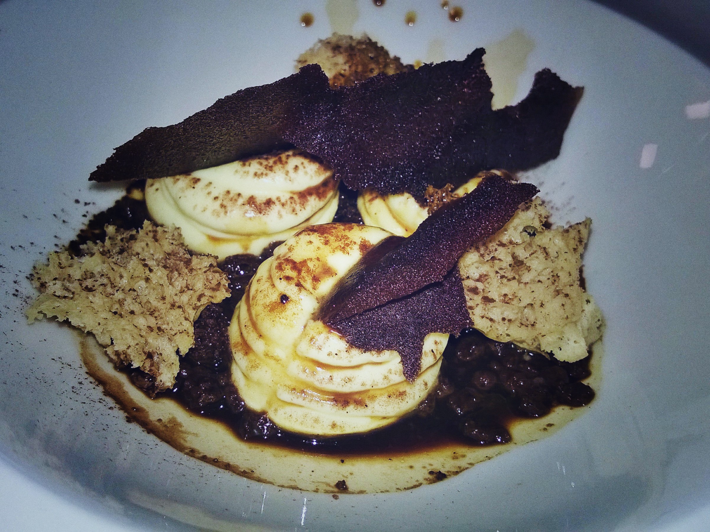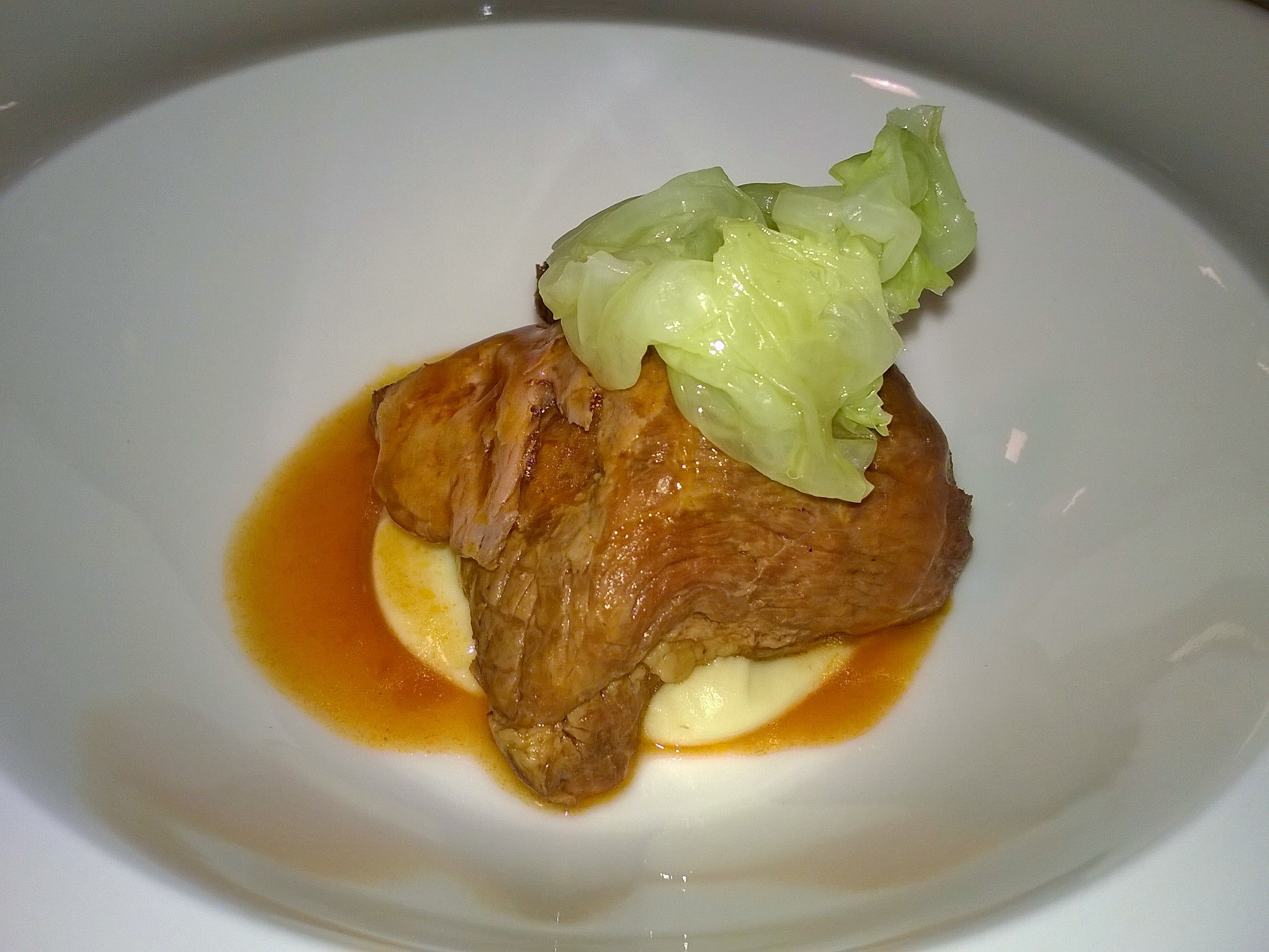 Stessa considerazione in questo secondo, meno scenico, ma che sicuramente ha visto il trionfo della stagionalità dei prodotti, emblema del territorio di Valva, comune del salernitano nell’Alta Valle del Sele, dal clima abbastanza rigido. Maialino, verza croccante, il concentrato di pomodoro, patate e tartufo si sono fusi alla perfezione, cottura a bassa temperatura in tempi lunghi, quel pizzico di anice stellato, la scioglievolezza delle carni e un infinito piacere nell’aver degustato gli strati tutti assieme, in un’esplosione di sentori che in bocca sono venuti fuori preponderanti, quasi a ricordare le ricette elaborate e gustose delle nonne dinnanzi al focolare domestico.
