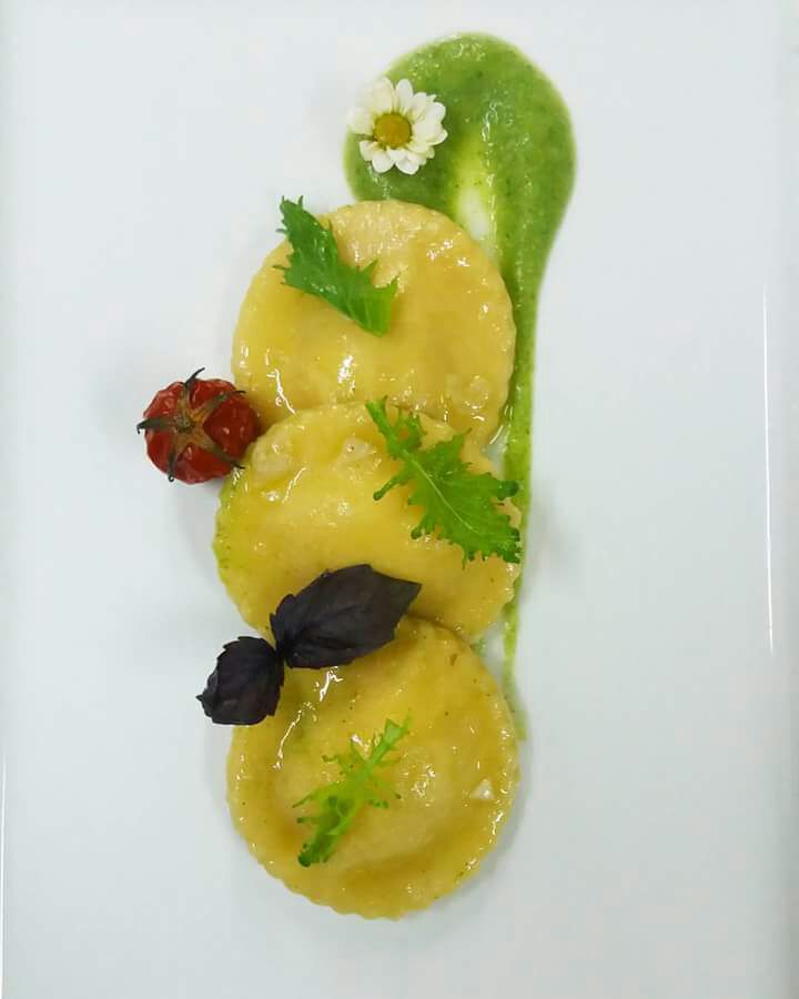 Preparare la pasta fresca unendo in una planetaria tutti gli ingredienti, ottenendo così un impasto liscio ed omogeneo. Far riposare in frigo per almeno un’ora; nel frattempo mescolare la ricotta con un po’ di sale, pepe e qualche noce sminuzzata. Mettere l’impasto in un sac a poche e conservare in frigo. Per la passatina di broccoli invece lessare il cavolo-broccolo e successivamente in un tegame far soffriggere dell’aglio nell’olio e un po’ di peperoncino. Aggiungere i broccoli precedentemente sbollentati, qualche alicetta salata e far cuocere con del brodo vegetale o acqua. Al termine della cottura con l’aiuto di un mixer ad immersione, si frulla il tutto ottenendo una “passatina”, ossia in gergo culinario una “cremina” densa, liscia e senza grumi. A questo punto formare dei ravioli ripieni di ricotta di qualsiasi forma (tondi quadrati, a cuore, cappellacci, ecc.) Ricavati tutti gli ingredienti, comporre il piatto. Calare quindi i ravioli nell’acqua che bolle; a parte in una padella soffriggere l’aglio nell’olio ed aggiungere dell’acqua. Scolare i ravioli e amalgamarli bene, spegnere il fuoco ed aggiungere la colatura di alici (va sempre aggiunta a fuoco spento per non alterare il sapore, quindi fare molta attenzione) senza esagerare. In un piatto di portata impiattare, ponendo la passatina di broccoli sul fondo di esso e i ravioli adagiati sopra, decorando con qualche erbetta fresca e fiorellini eduli. Buon Appetito da Gianpaolo!