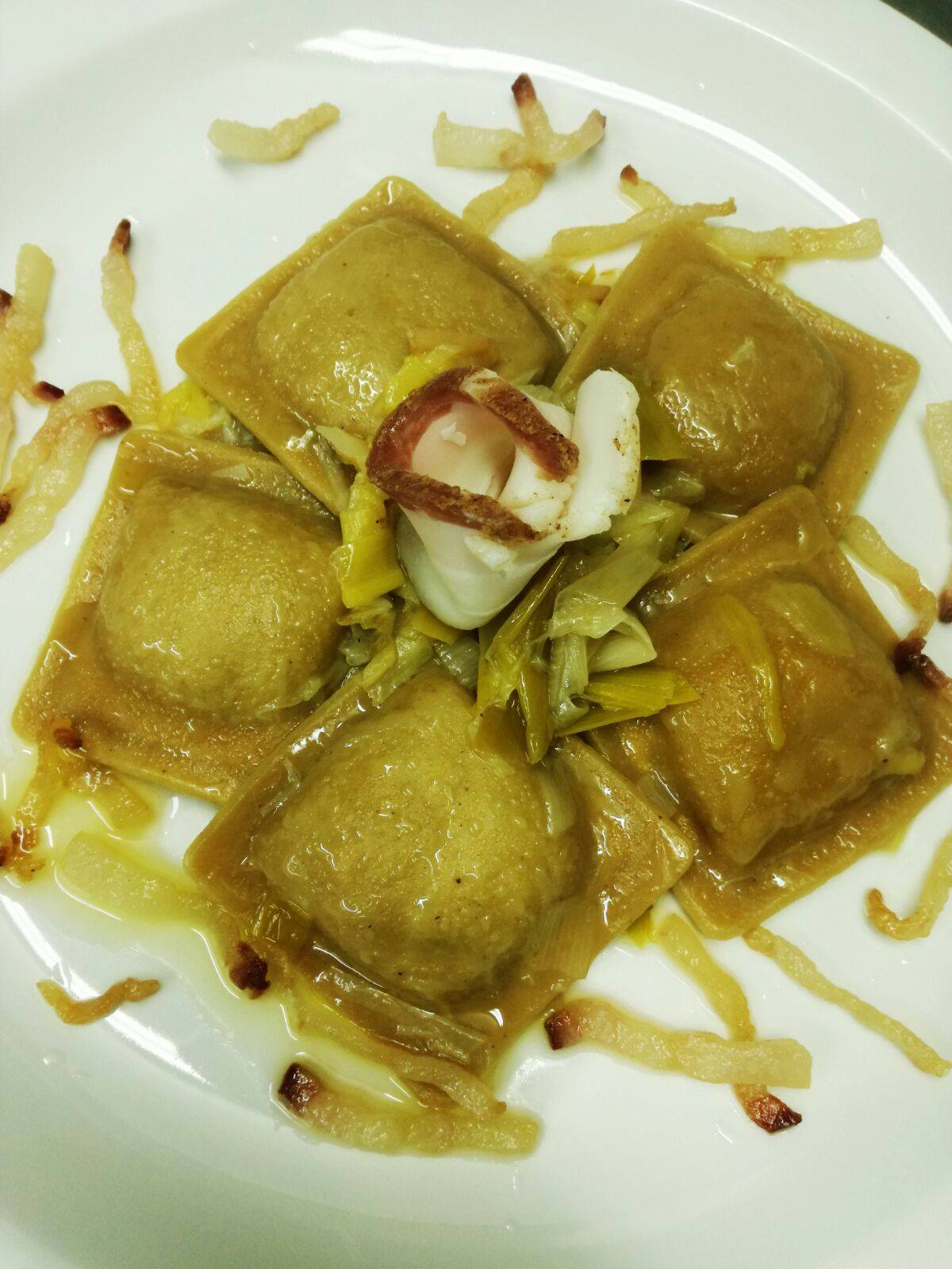 Preparate la sfoglia dei ravioli: mescolate in una ciotola capiente le 3 farine assieme a un pizzico di sale. Sgusciate le uova e il rosso e incominciate a mescolare il tutto con una forchetta. Se il composto vi dovesse risultare troppo secco aggiungete qualche cucchiaio d’acqua fredda. Formate una palla liscia d’impasto, avvolgetela nella pellicola per alimenti e lasciatela riposare per 30 minuti. A parte, mescolate la ricotta con il formaggio e le castagne lessate e setacciate, pizzico di sale e pepe. Infarinate il piano di lavoro e, con l’aiuto di un mattarello o della macchinetta per la pasta, tirate una sfoglia non troppo fine. Con uno stampino quadrato tagliate tanti quadratini. Riponete una cucchiaiata di impasto al centro di ogni quadrato e richiudetelo con un altro quadrato. Se la pasta si dovesse essere asciugata troppo, inumiditela con le dita leggermente bagnate. Radunate i ravioli su un vassoio e cospargeteli con un po’ di semola. Nel frattempo lavate il porro, tagliatelo a rombi e fatelo brasare in un po’ di olio lentamente. Quando è quasi cotto aggiungete un po’ di vino bianco, sale e pepe. Portate a ebollizione abbondante acqua salata e cuocete i ravioli per circa 4 – 5 minuti. Una volta cotti, raccogliete i ravioli di castagne con un colino e versateli nei porri. A parte nel frattempo fate rosolare il lardo tagliato a julienne, che andrete a mettere sui ravioli al momento di servirli.