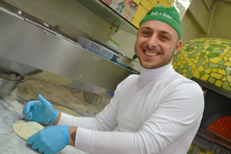 A Napoli l’offerta gastronomica dei locali – soprattutto quelli ubicati nel centro storico – è quasi sempre inversamente proporzionale alla grandezza degli stessi: posti piccolissimi, equivalenti a poco più di una comune stanza, sono dei veri e propri laboratori del gusto ove menti creative sono continuamente a lavoro e “sfornano “ (nel vero senso del termine) decine di idee che – opportunamente combinate – vengono concretizzate in centinaia di prodotti golosi. “Bell e Kavr” è uno di questi: questo piccolo universo del gusto salta subito all’occhio per il colore verde acceso del logo dell’insegna, poi ripreso anche nelle finiture dell’ingresso. Subito l’attenzione si sposta sulla vetrina colma di squisitezze: frittatine per tutti i gusti (notevoli quella con i friarielli, quella con la zucca e lo speck e quella farcita col salame Napoli e il crocchè), calzoni (fritti e al forno), arancini, pizze a portafoglio, la classica “Frittata ‘e maccarune”, la pizza fritta… Ma non è finita qui! Ci sono due “opere d’arte” che meritano una menzione a parte: il “Pignatiello” e “O’ cappiell ‘e Pulecenella”. Alla base di entrambi c’è l’impasto della pizza, che il giovanissimo pizzaiolo Alessandro Borella fa lievitare per oltre 48 ore. Il primo viene plasmato dalle mani di Alessandro a mo’ di “pignatiello”, il secondo invece assume la forma di un cono che viene prima fritto e poi passato al forno (per elevarne il grado di croccantezza). Per le farciture non vengono posti limiti alla provvidenza: si può scegliere quella classica, con pomodoro e mozzarella, oppure una versione light con la scarola, od ancora una gourmet con provola di Agerola, mortadella, crema e granella di pistacchio di Bronte. Dal forno di Bell e Kavr ogni giorno Alessandro sforna centinaia di pizze: dalle classiche (marina a margherita sono ovviamente le preferite) a quelle speciali (ad esempio quella al gusto “Alessandro”, oppure la pizza con tarallo sbriciolato, pomodorini del piennolo e mozzarella, od ancora la “San Gennaro” con pomodorini gialli, pomodoro, mozzarella e basilico). Tutte farciture sono ideate da Alessandro e da Marilena Alberoni, “supervisor” di produzione, appellata nel quartiere come “Donna Sofia” per la sua beltà e la sua simpatia. Gli ingredienti adoperati sono di primissima qualità ed alcuni sono “fatti in casa”, come il pesto di pistacchio o il sugo alla Genovese.