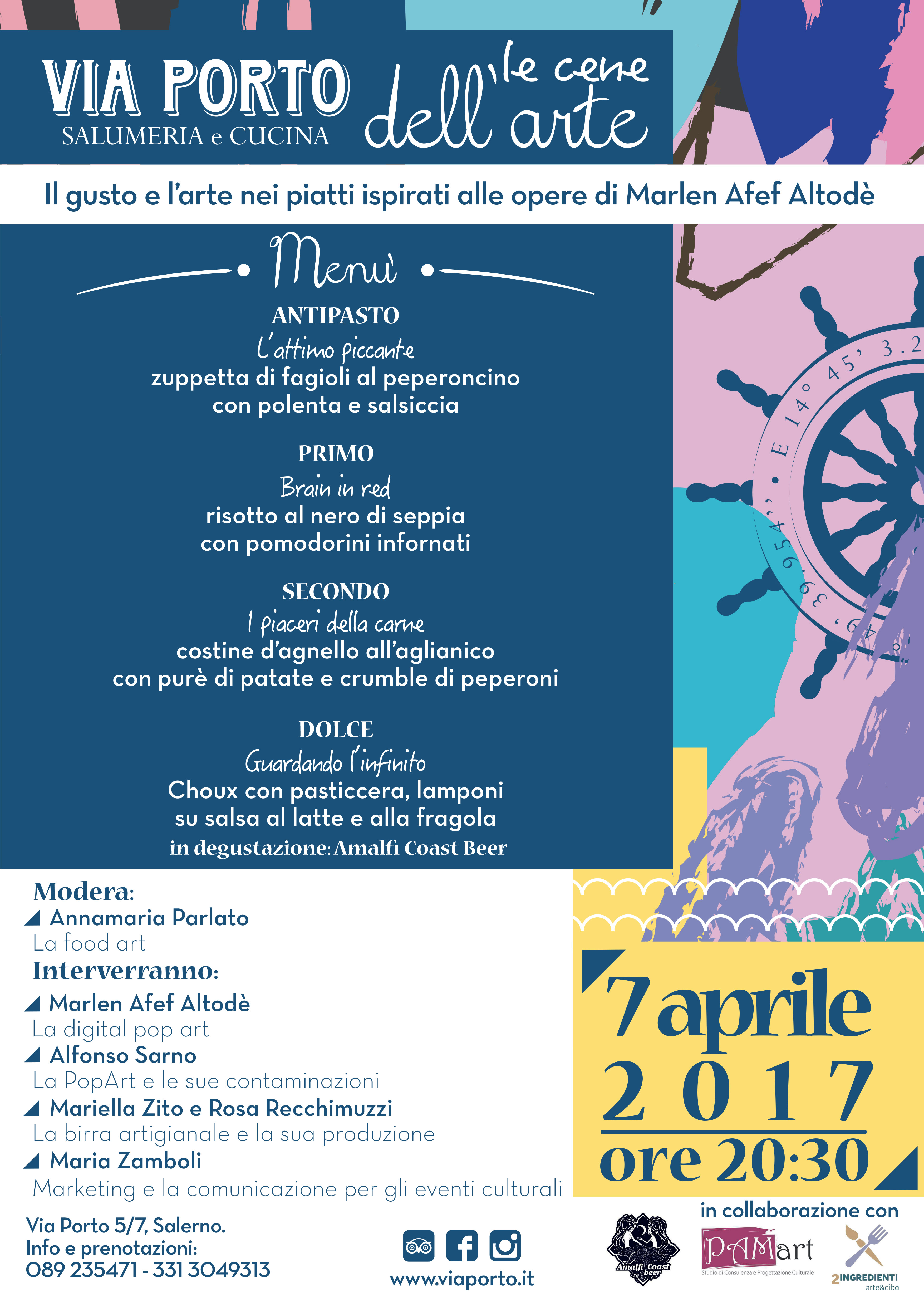 Dopo l’enorme successo del “Pop Aperitif” dello scorso 9 marzo con vernissage d’inaugurazione della mostra “A world of colors” dell’eclettico artista salernitano Marlen Afef Altodè, esponente della “Digital Pop Art”, venerdì 7 aprile alle ore 20:30 si proseguirà con una cena esperienziale, che avrà lo scopo di far conoscere approfonditamente al pubblico le opere esposte al Ristorante Via Porto Salumeria&Cucina. “Tre aperitivi d’artista, tre mostre e tre cene dell’arte” fanno parte di un illuminato progetto promosso dal Ristorante Via Porto Salumeria&Cucina ma ideato dallo Studio PAMart e dal Food Blog 2Ingredienti Arte&Cibo della storica dell’arte e giornalista Annamaria Parlato, che si susseguiranno sino a giugno per permettere ai salernitani e a chiunque lo desideri di approfondire aspetti culturali collegati all’arte contemporanea anche attraverso il cibo d’eccellenza. La prima Cena dell’Arte sarà sicuramente una possibilità di esplorare mondi che non sono così distanti tra loro, quelli dell’arte e del cibo appunto, fortemente interconnessi, e mangiare i piatti, vere e proprie “installazioni commestibili”, preparati dallo chef Carlo Libano e dal suo staff di cucina. Un modo per compenetrarsi con l’arte stessa e percepirne tutta la complessità: forme, linee e colori ottenuti dalla mescolanza di alimenti che assemblati con cura, fantasia e abilità dallo chef, riprenderanno quattro opere di Marlen Afef Altodè esposte in sala.