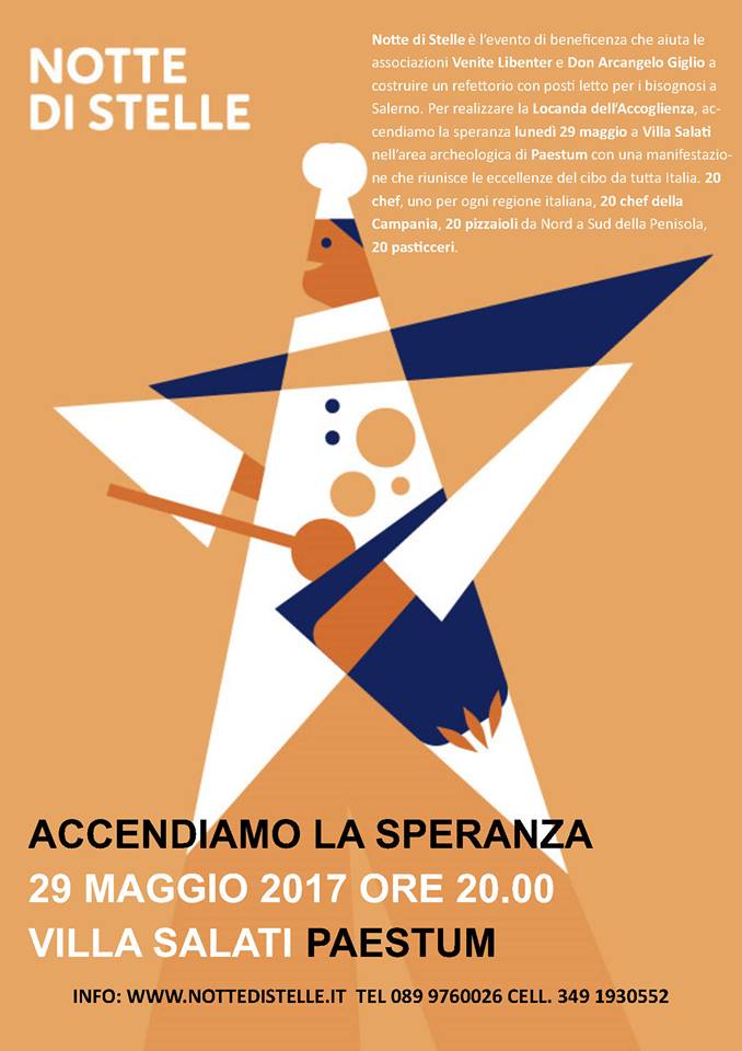 “Notte di Stelle” è l’evento di beneficenza organizzato per lunedì 29 maggio alle ore 20 nell’ex Villa Salati, nell’area archeologica di Paestum (Salerno), per aiutare le associazioni Venite Libenter e Don Arcangelo Giglio che intendono costruire una Locanda dell’Accoglienza .