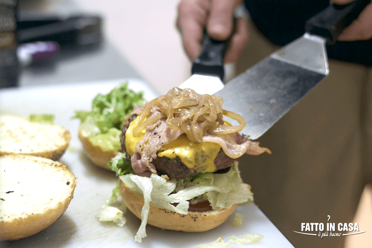 Lavate e tagliate a rondelle il pomodoro e mettete da parte. Lavate l’insalata e tagliatela a listarelle o lasciatela in foglie. Scaldate una padella antiaderente o una ghisa, appena calda adagiateci su gli hamburger e salateli da un lato e poi dall’altro. Fateli cuocere per 4 minuti al lato circa. All’ultimo minuto adagiateci su le fette di cheddar. Sempre in una padella cuocete il bacon. Tagliate in panini in due (meglio se realizzati in casa oppure ordinati dal panificio di fiducia) e spalmate sulla base del panino un po’ di burro e mettili a scaldare. Appena gli hamburger sono pronti passate all’assemblaggio del vostro panino: partite dalla base con una goccia di salsa BBQ, adagiateci su l’insalata, l’hamburger con il cheddar, il bacon croccante, le cipolle caramellate e infine il pomodoro.