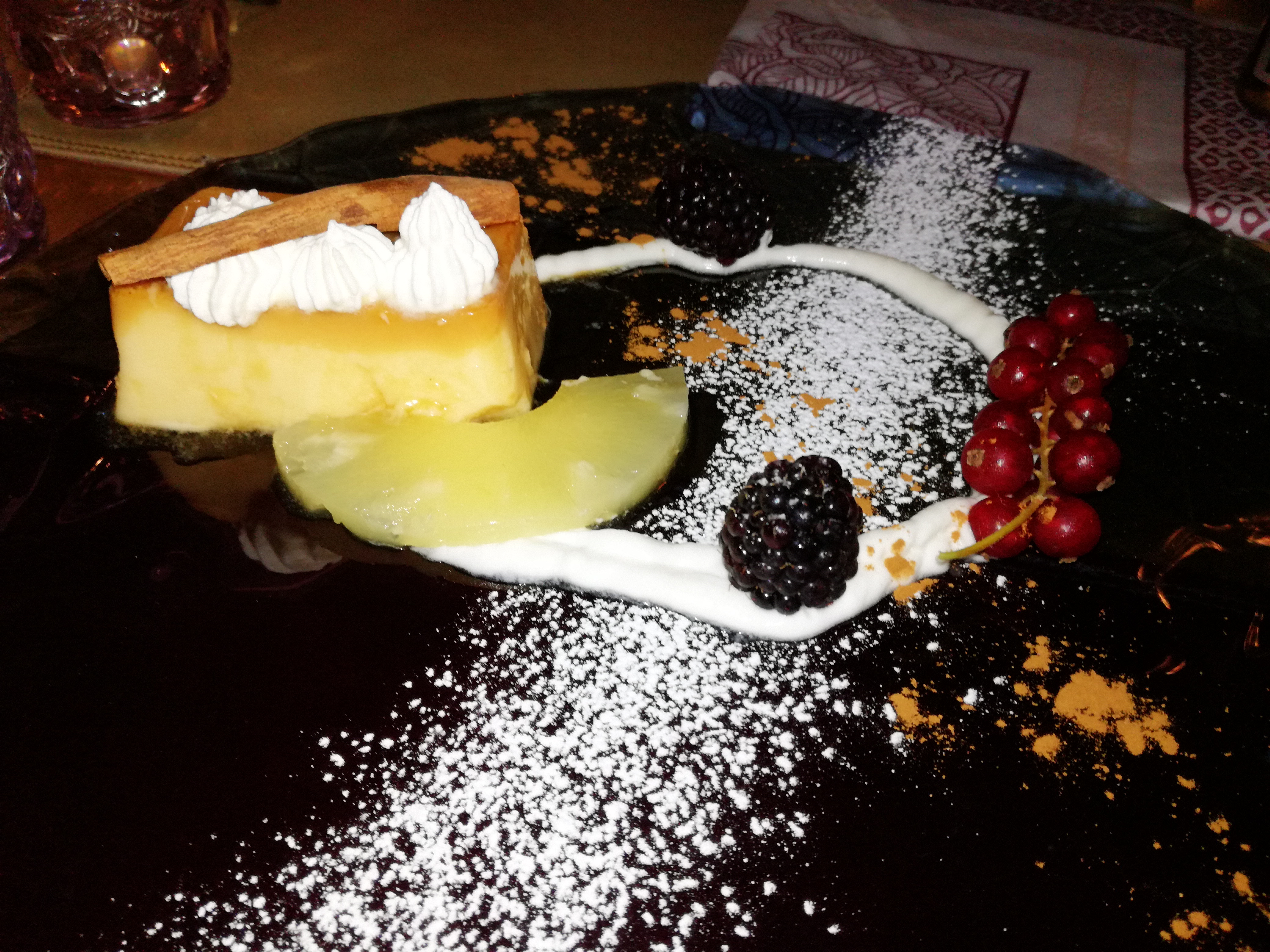 e “Crème caramel all’ananas con crema al cocco, cannella e frutti rossi”, la cui presentazione al piatto è valsa da sola tutta l’esperienza gastronomica in questo locale.