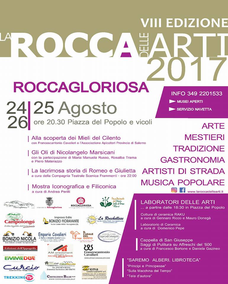 “La Rocca delle Arti è una delle più importanti manifestazioni del cartellone estivo cilentano. Il successo dell’evento è dovuto soprattutto agli intrattenimenti di ogni genere che allietano le serate del 24-25-26 agosto” così afferma Mirko Grizzuti, Presidente della Proloco di Roccagloriosa.