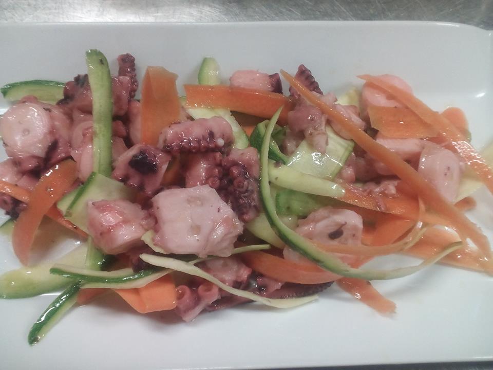 Insalata di polpo con scaglie di carote e zucchine