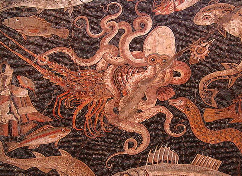 In arte esistono mole raffigurazioni marine con polpo, soprattutto all’interno dei mosaici rinvenuti a Pompei, in particolar modo nelle Domus patrizie. Il mosaico in basso rinvenuto nella Casa del Fauno di Pompei, in I stile pompeiano, presenta una cornice con elementi vegetali, crateri, vasi potori, amorini in volo, uccelli e altri animali, e raffigura alcune varietà di pesci commestibili del Mediterraneo. Nell’angolo inferiore destro e nel centro del lato sinistro si intravede un paesaggio costiero, su cui è in agguato un martin pescatore. Intorno alla scena centrale, costituita dalla lotta tra un polpo e un’aragosta, si distribuiscono numerosi pesci, tra cui si distinguono un gambero, una triglia, una spigola, una conchiglia di murice, una murena, uno scorfano, un’orata e una razza. (http://www.museoarcheologiconapoli.it/it/sale-e-sezioni-espositive/mosaici/)