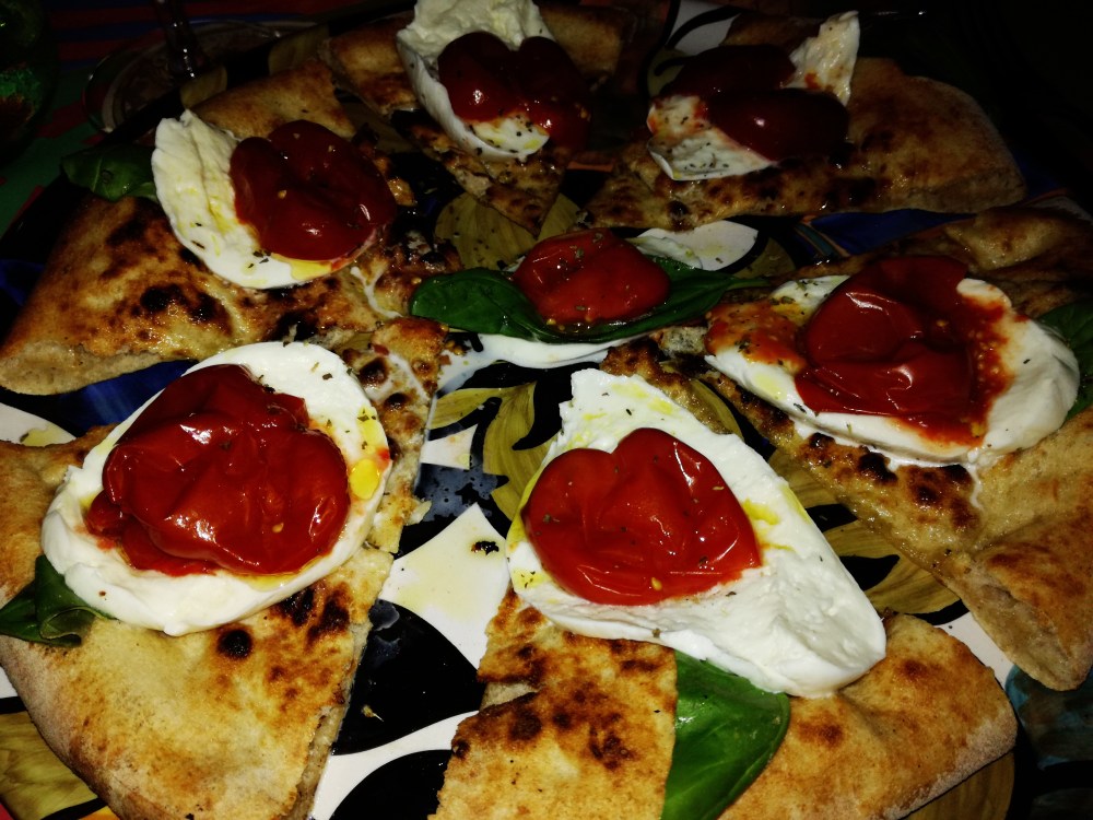 Ho continuato con quelle super gourmet. Di cui la “Caprese d’inverno” composta da spicchi di pizza bianca, su cui a crudo sono state adagiate fette di mozzarella di bufala campana DOP, pomodorini corbarini in acqua e sale, origano di montagna, olio EVO BIO e basilico;