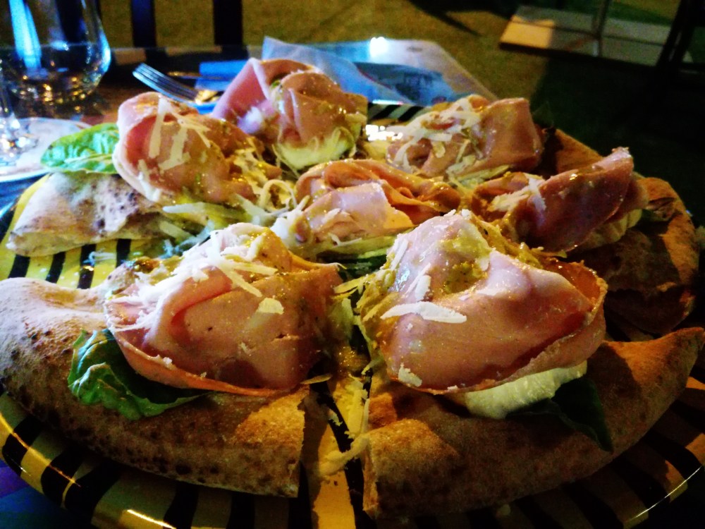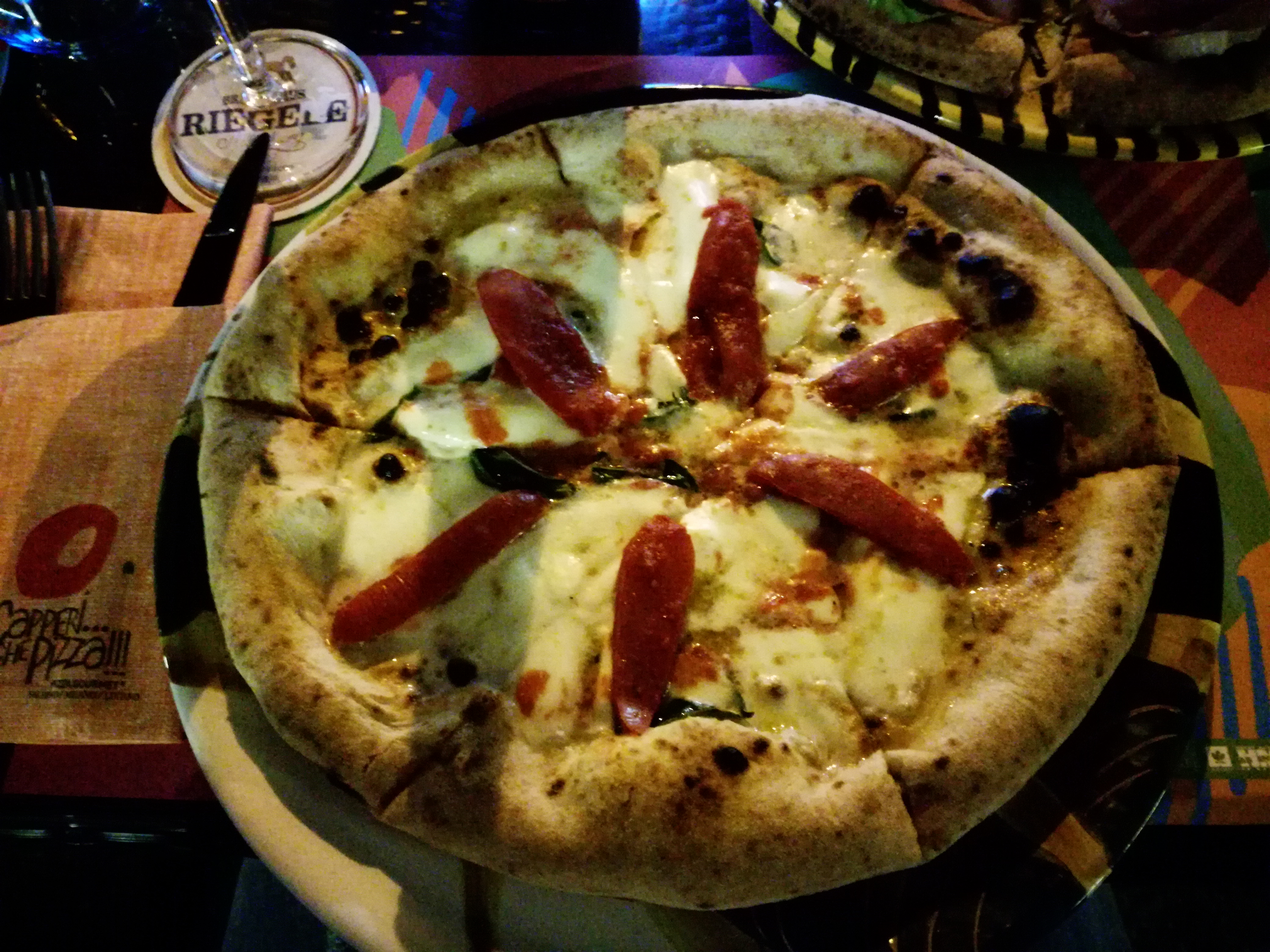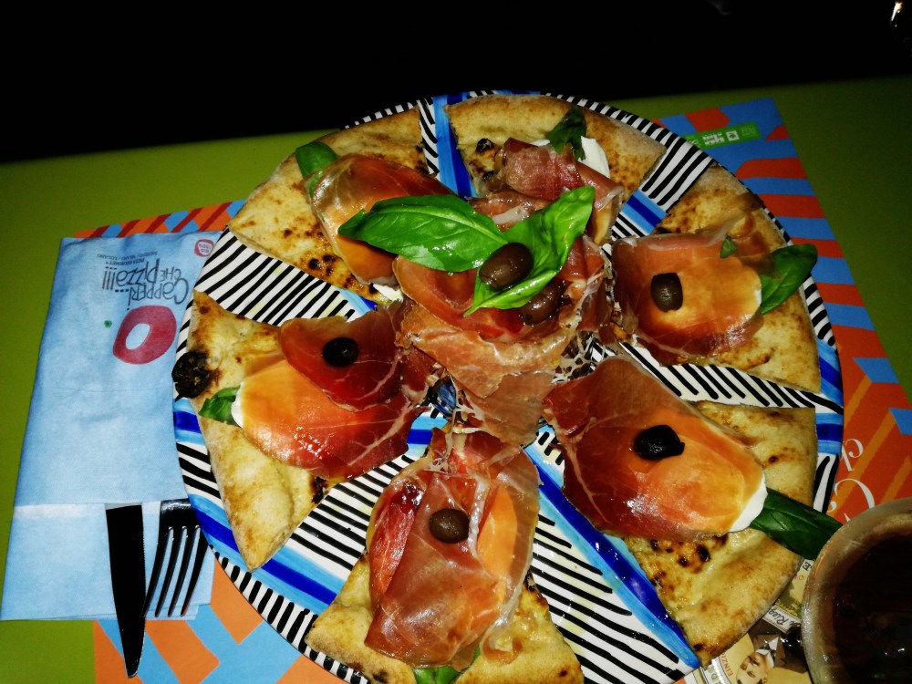 Dopo tutto quest’osservare e gironzolare la fame è incalzata e quindi mi sono accomodata all’esterno, approfittando ancora del clima favorevole che solo la bella stagione può regalarci. Ed ecco il momento più desiderato e idealizzato: la degustazione delle pizze gourmet. Si perché questa pizzeria è un progetto innovativo che nasce da un attento percorso di ricerca e selezione avviato dalla famiglia Acciaio negli anni ’60, partendo dall’area del Vesuvio con le gastronomie Lucullus, in particolare da Giuseppe. Sul sito internet del locale (www.capperichepizza.com) viene spiegato molto bene quanto lavoro c’è dietro ad un progetto di pizza definita oggi “gourmet“, e infatti si può leggere:” Selezione ed affinamento di formaggi italiani, lavorazione di salumi, pomodori speciali, conserve di tonno ed alici sublimi. I profumi della terra e del mare presentati in botteghe di specialità, che col tempo si sono arricchite fino ed evolversi nella nuova era delle pizzerie gourmet. Pizzerie cioè che pongono in primo piano il buono e saporito, senza sotterfugi e con attenzione estrema al benessere del cibo e quindi del consumatore. Pizzerie che accompagnano ogni ricetta con informazioni dettagliate degli ingredienti, dalla tracciabilità con rapporti diretti con i produttori del circuito ai metodi di lavorazione, per esaltarle al meglio al palato ed indicare i giusti abbinamenti, così da rendere le ricette sempre equilibrate, in ogni aspetto.” E quindi dopo questa soddisfacente premessa mi sono accinta ad addentare le mie pizze fumanti su piatti di ceramica vietrese e a placare la sete con dell’ottima birra artigianale.