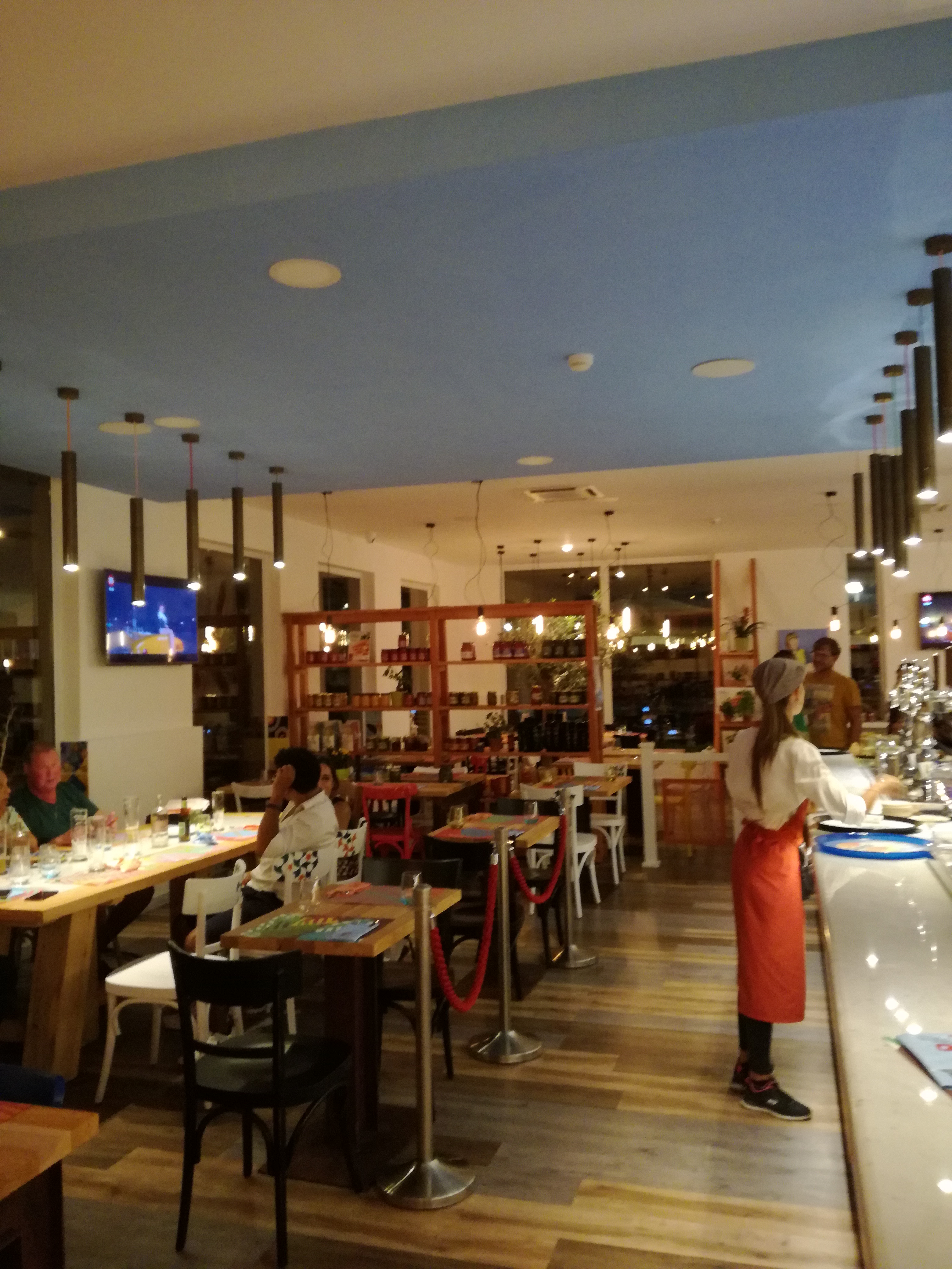 E poi mi si è aperto un mondo fatto di colori, pezzi di design accuratamente assemblati con manufatti in legno, maioliche colorate e mensole con i prodotti esposti in bella mostra, che volendo possono essere anche acquistati in loco, tra cui tipicità DOP, IGP e Slow Food, garanzia di digeribilità e benessere del cibo. Perfino un albero di ulivo è stato inserito al centro di un tavolo, per ricreare quell’atmosfera di convivialità ispirata dalla natura del territorio, con la quale tutto il locale è in sintonia.