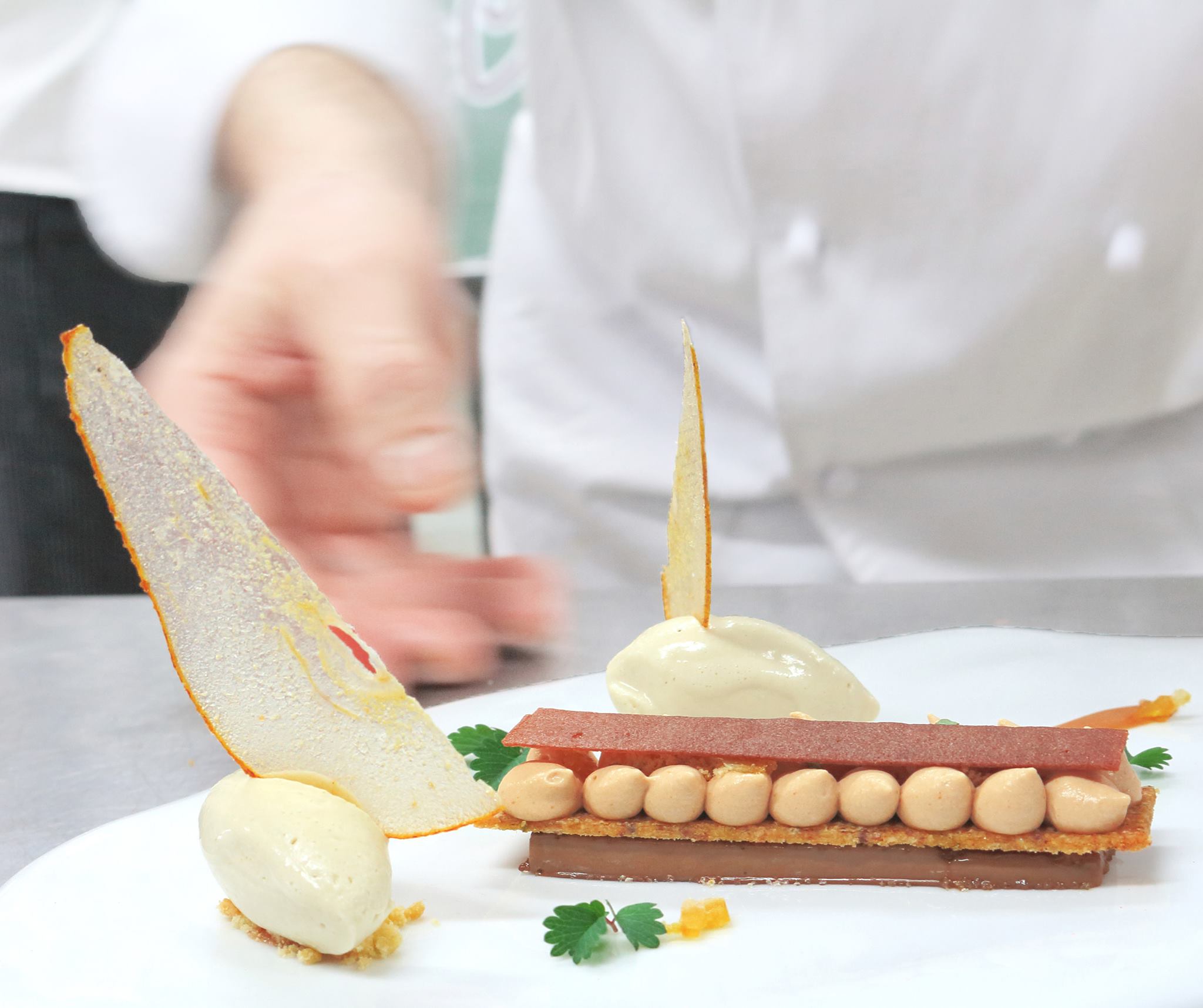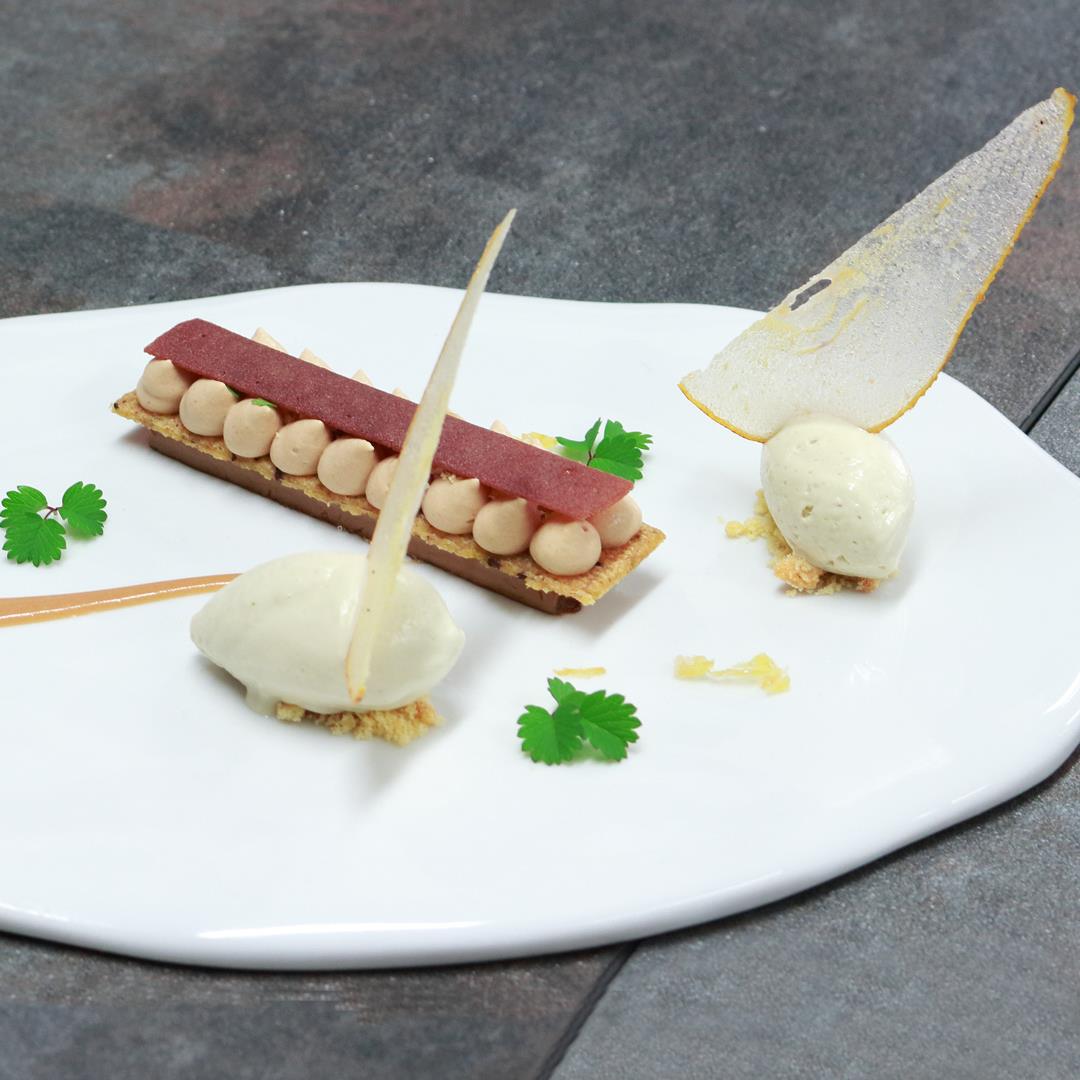 Disporre la creme brûlé nel piatto, coprire con poco zucchero di canna e caramellare. Collocare al di sopra un rettangolo di pasta sablée all`alloro e coprire con spuntoni di caramello montato alla pera. A questo punto mettere alcune gocce di aceto bianco agrodolce, dei pezzi molto piccoli di dragoncello fresco e di zenzero candito grattugiato. Coprire con la cialda al caffè e poi porre la quenelle di gelato alla noce con una fetta di pera essiccata tagliata a metà