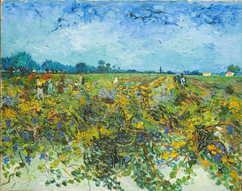 Vigna Verde infatti è una tela del pittore olandese Van Gogh, datata al 1888 e conservata al Kröller-Müller Museum di Otterlo, in cui egli rivolgeva totalmente la sua attenzione alla campagna e ai lavoratori della terra, apprezzandone l’umile dignità e riproducendo con il proprio innovativo linguaggio visivo il rapporto uomo-natura e le tematiche esistenziali.