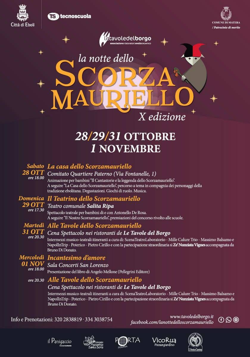 Il 31 ottobre e l’ 1 novembre, poi, La Notte dello Scorzamauriello entra nel vivo con le ormai tradizionali e attese cene spettacolo all’interno dei cinque locali de Le Tavole del Borgo- Il Panigaccio, Vico Rua, L’Antica Cantina, Portadogana, Piazzetta Santa Sofia che, nelle serate del 31 ottobre e del 1 novembre, si trasformeranno in un vero e proprio “palcoscenico” dell’arte e del gusto, ospitando intermezzi musico- teatrali itineranti e tematici. Insieme alla cucina di qualità di ispirazione territoriale, a caratterizzare le cene spattacolo saranno le melodie partenopee di Mille Culure Trio; la comicità “d’autore” dell’attore Massimo Balsamo e NapolinTrip; l’intensità di Alessandro Tedesco e Margherita Rago, del Laboratorio Scena Teatro con “’O Munaciello….Tra Petito e De Simone”; i virtuosismi musicali dei cilentani Poterìco, direttamente dallle semifinali di Italia’s Got Talent 2015; le sonorità tradizionali ma contaminate di Pietro Cirillo, “l’anima tarantata della Lucania”, tra gli esponenti più apprezzati della musica popolare di questa meravigliosa “terra di mezzo” alla quale guarda l’orizzonte di questa edizione 2017.