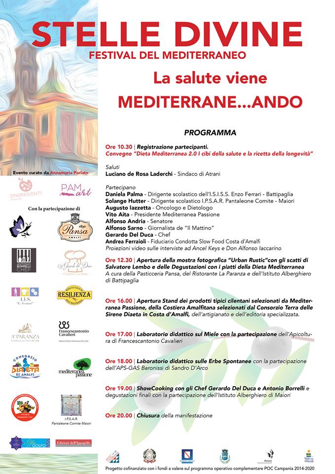 Sabato 2 dicembre presso la Casa della Cultura nello splendido borgo di Atrani-Costiera Amalfitana, prende il via l’evento “La salute vien Mediterrane…Ando”, curato dalla giornalista enogastronomica Annamaria Parlato, all’interno di Stelle Divine-Festival del Mediterraneo. Stelle Divine – Festival del Mediterraneo, diretto artisticamente dal Dott. Giuseppe Errico, è finanziato dalla Regione Campania e promosso nell’ambito dell’intervento co-finanziato dal Poc Campania 2014-2020 “Rigenerazione urbana, politiche per il turismo e la cultura-Programma regionale di eventi e iniziative promozionali”.
