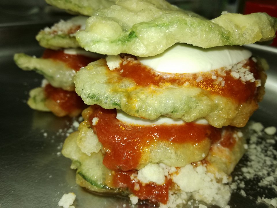 Prendere le foglie di borragine lavarle e asciugarle, poi passarle nella pastella fatta con 200 ml di acqua gassata, 100 gr di farina e 1 tuorlo d’uovo, poi friggerle in olio per frittura. A parte preparare la salsa di pomodoro facendo rosolare la cipolla tritata nell’olio extra vergine di oliva e i pelati. Salare e far cuocere per circa 15 minuti poi mixare. Tagliare la mozzarella di bufala a fette e mettere da parte 100 gr di parmigiano grattugiato con qualche foglia di basilico. Prendere una placca, imburrarla e disporre la prima foglia di borragine fritta e poi mettere sopra un po’ di salsa pomodoro, poi la fetta di mozzarella, poi il formaggio e la foglia di basilico. Alternare di nuovo sino a creare una torre, facendo un altro strato e finendo con un altra foglia di borragine, il pomodoro e un po’ di parmigiano. Preparare altre tre porzioni e poi infornare a 170 gradi per circa 12 minuti. Togliere dal forno e disporre nel piatto decorando a piacere. Servire calda.