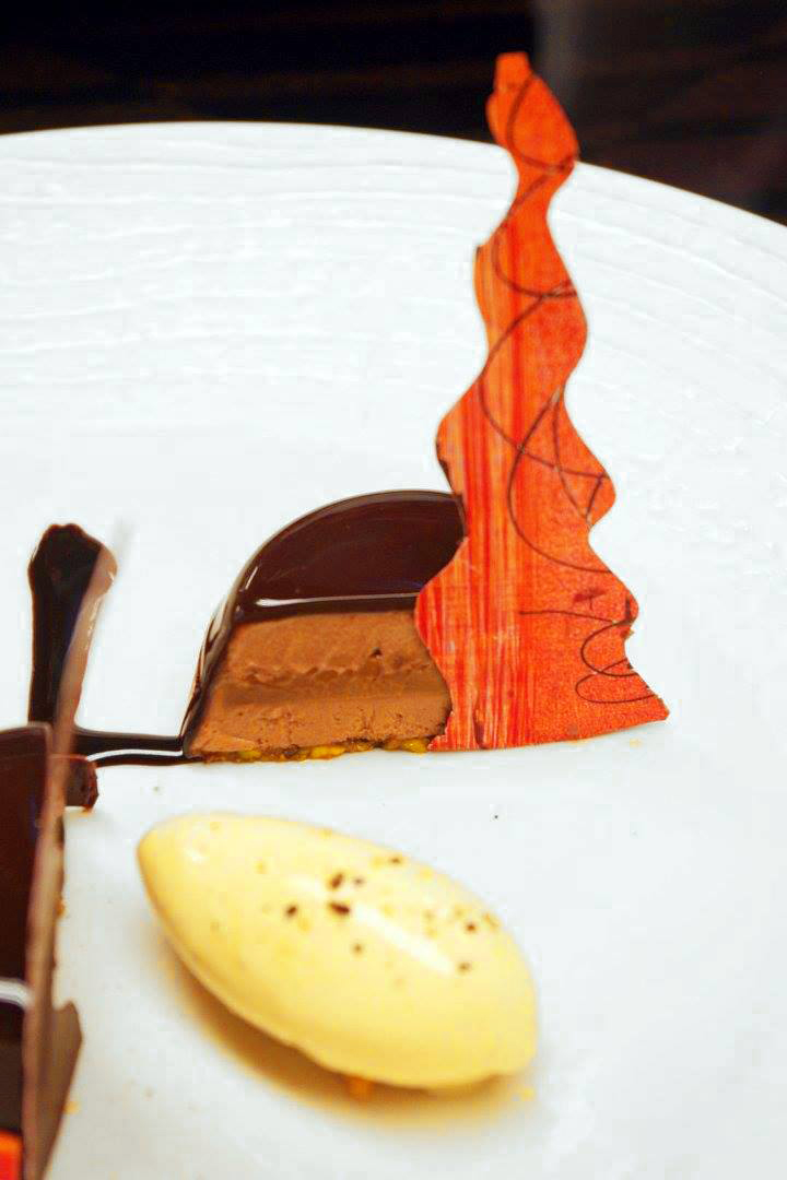 Idratare la gelatina in abbondante acqua e sgocciolarla per bene. Sciogliere la gelatina con una piccola quantità di crema inglese, dopo aggiungere la parte restante. Emulsionare la crema inglese con il cioccolato sciolto. Controllare che il composto sia a 35-40ºC. Incorporare la panna montata, miscelare con la marisa.