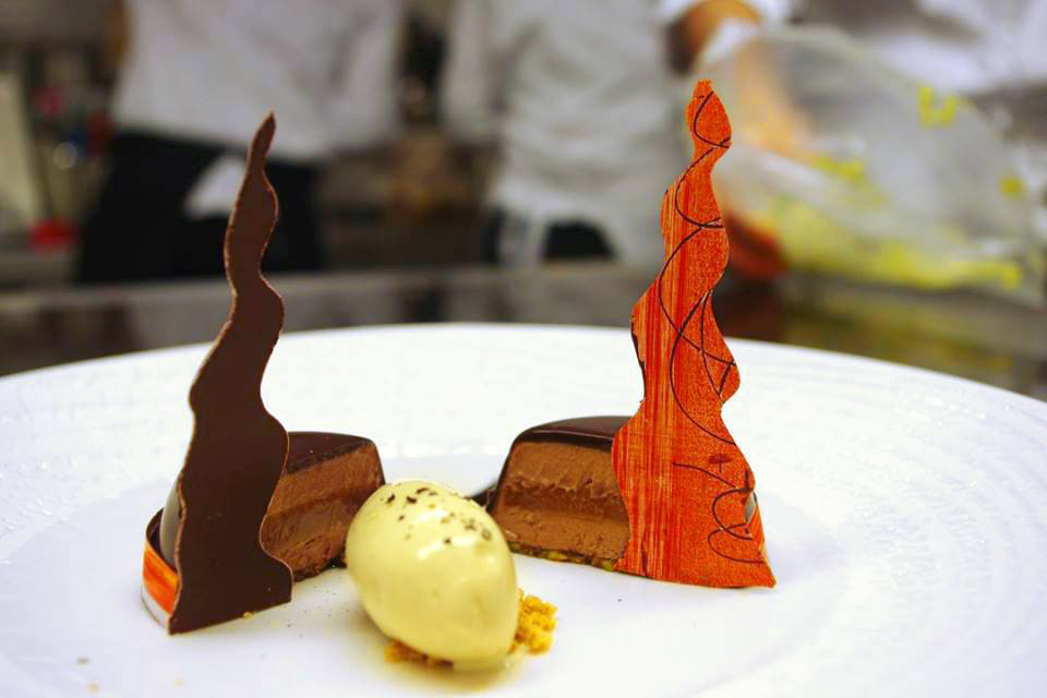 Sciogliere il cioccolato a 45ºC, versare sopra al pralinato, miscelare e aggiungere i pistacchi tritati e il peta zeta, lasciar cristallizzare leggermente e stendere.