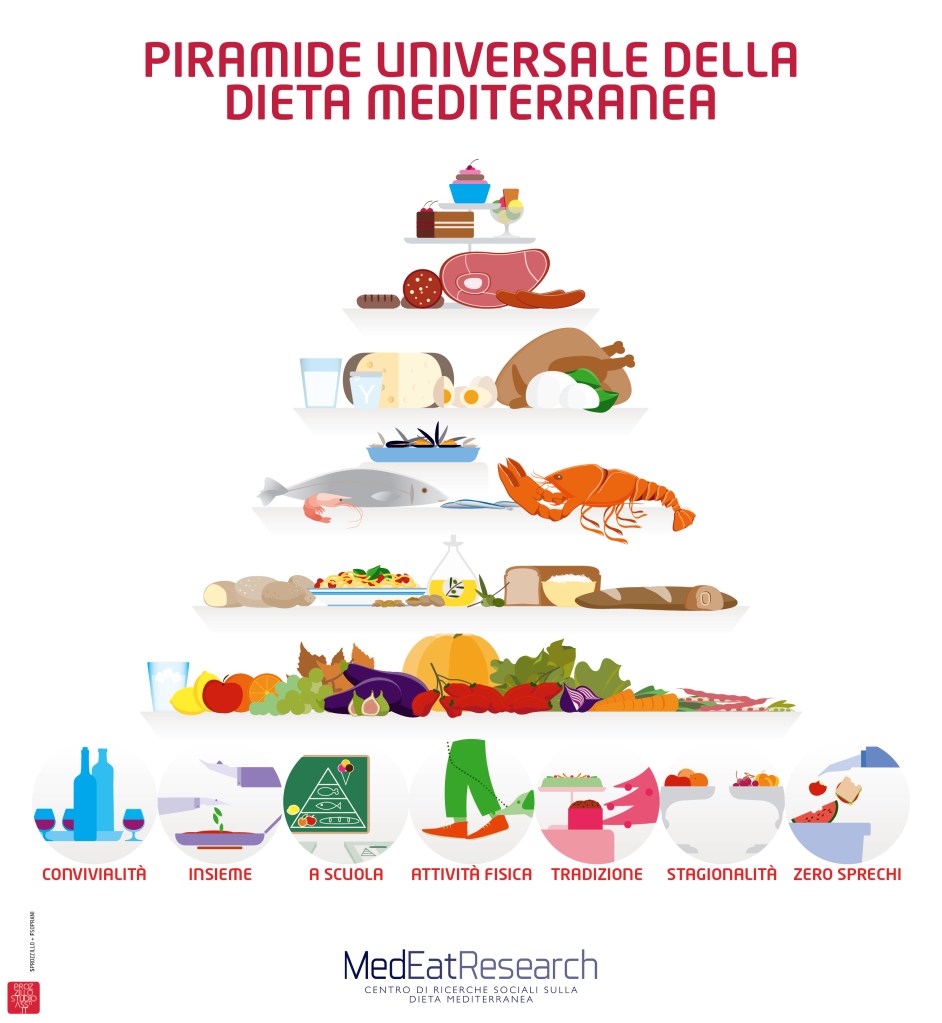 La Dieta Mediterranea senza ombra di dubbio affonda le sue radici nell’alimentazione e nella cucina dell’antica Grecia. La cucina greca e magnogreca era frugale, riflettendo un’economia basata sull’agricoltura povera. Era fondata sulla “triade mediterranea”: frumento, olio di oliva e vino. Si dice che i Greci avessero vino rosso, rosato e bianco. Come al giorno d’oggi, ve ne erano di diverse qualità, dal normale vino da tavola a quello di qualità. I Greci a volte addolcivano il loro vino con miele e lo rendevano medicinale aggiungendo timo, menta e altre erbe aromatiche. Il vino veniva generalmente allungato con l’acqua. Il consumo di vino non miscelato o “akraton”, usanza praticata dai barbari del nord, si pensava rischiasse di portare alla pazzia e alla morte. Molti secoli dopo la Scuola Medica Salernitana aveva saputo fondere le quattro grandi culture mediterranee del passato (l’ebraica, l’araba, la greca e la latina), mettendo la prevenzione al primo posto come modello di vita salutare, anziché concentrarsi su approcci di tipo terapeutico. Di primaria importanza erano considerate già allora l’armonia psico-fisica e la dietetica come regole di vita; le proprietà medicamentose delle piante officinali vennero studiate e sfruttate nell’alimentazione quotidiana e altra grande importanza venne attribuita agli effetti benefici del vino.