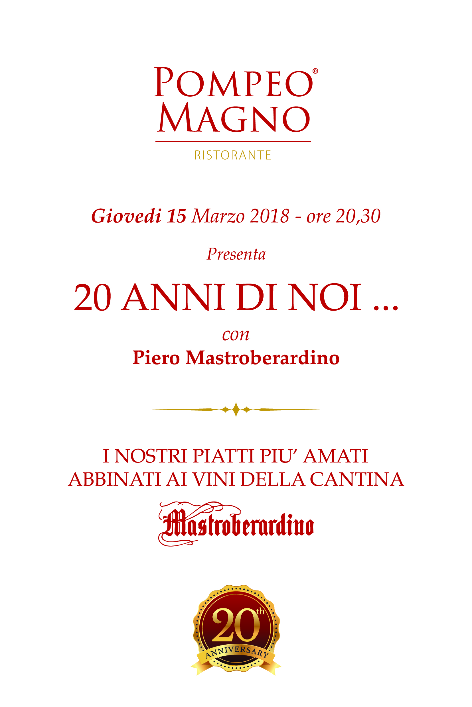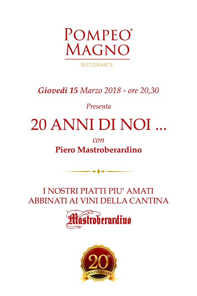 “Stiamo ripercorrendo i vent’anni di attività del Pompeo Magno – spiegano Michela Del Sorbo e Gerardo Esposito, proprietari dello storico ristorante pompeiano – e i protagonisti di questo nostro entusiasmante viaggio. In tal senso abbiamo chiesto a Mastroberardino, che nell’ultimo ventennio ha investito tanto sulla città di Pompei compreso il recupero dell’antico vitigno presente negli scavi, di onorarci di una serata dedicata ai 20 anni di attività delle nostre aziende”.