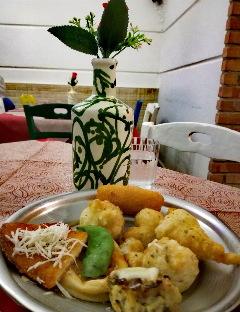 La location è una tipica architettura a volte con pietre a vista e travi in legno della fine dell’Ottocento, un tempo deposito e ricovero per i cavalli e successivamente anche clinica, ad ogni modo una storia interessante. In previsione del digiuno penitenziale del Venerdì Santo e quindi incoraggiata dalla cordialità del personale di sala, sono stata invogliata ad assaggiare le specialità più richieste dai clienti: i fritti e la pizza. C’è da dire che Barbacià è anche cucina tipica, infatti pochi piatti vengono proposti a seconda della stagionalità e della reperibilità dei prodotti come: braciole di capra al ragù, polpette di manzo, insalata di stoccafisso o baccalà, baccalà fritto con scarole, iammarielli (gamberetti di fiume), taglieri di formaggi e salumi a presidio Slow Food, antiche preparazioni a base di verdure, zuppa di cozze e primi piatti campani a base di San Marzano DOP.