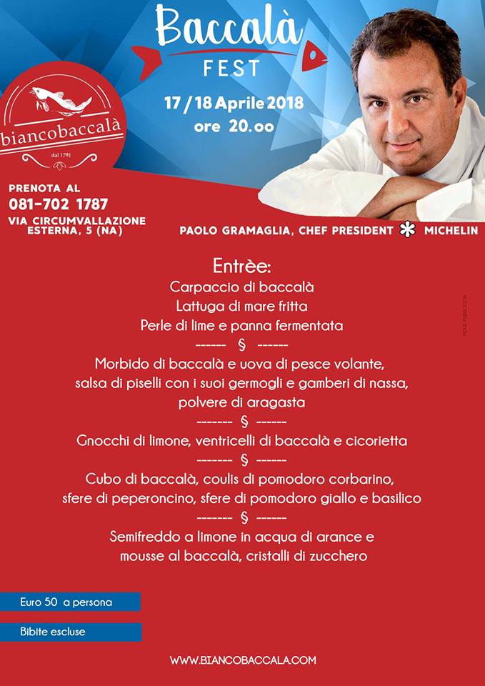 L’evento vedrà la speciale partecipazione dello chef Paolo Gramaglia stella Michelin, patron del ristorante “ President” di Pompei che in occasione del BaccalàFest ha messo a punto uno speciale menù per gli ospiti dell’evento a cui hanno aderito: Gianluca Eminente, Console dell’Islanda e titolare dell’azienda Unifrigo Gadus s.p.a una delle maggiori aziende importatrici di baccalà nel mondo, Toti Lange, Presidente dell’ “Accademia Baccalajuoli” , Tommaso Esposito, Vice presidente dell’ “Accademia Baccalajuoli” nonché giornalista enogastronomico e autore di pubblicazioni sull’argomento, ospiti del patron Nino De Filippo patron del ristorante “Biancobaccalà”.