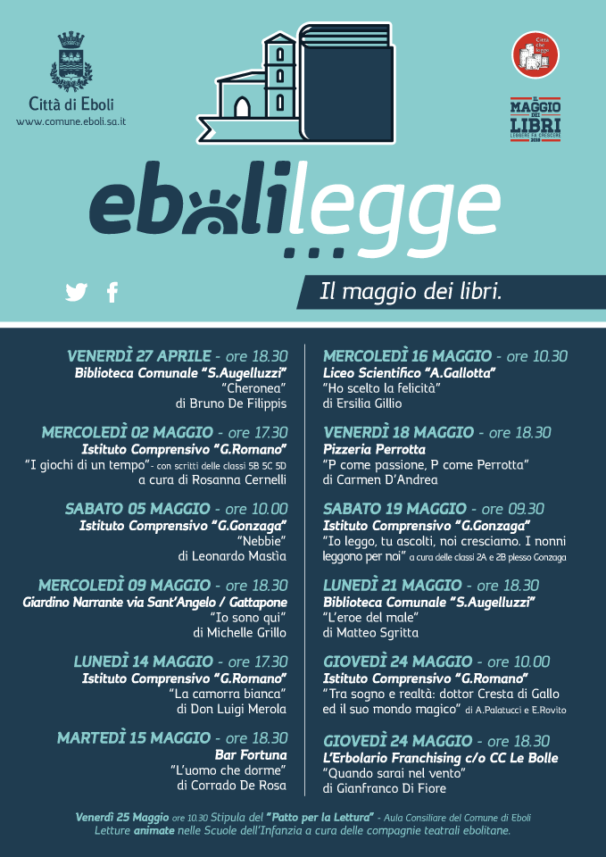 L’appuntamento rientra nel cartellone dei “Eboli Legge- Il Maggio dei Libri”, realizzato nel solco della campagna nazionale di promozione della lettura, che conta numerosi appuntamenti dedicati al libro ospitati in luoghi insoliti della città ma anche nella biblioteca comunale e nelle scuole. Il calendario delle inziative si concluderà il prossimo 25 maggio con la stipula del “Patto per la Lettura della Città di Eboli”: un impegno collettivo, siglato dal Comune, dalle istituzioni scolastiche e da altri soggetti rientranti nella “filiera del libro”, a sostenere in maniera sinergica la promozione della lettura.