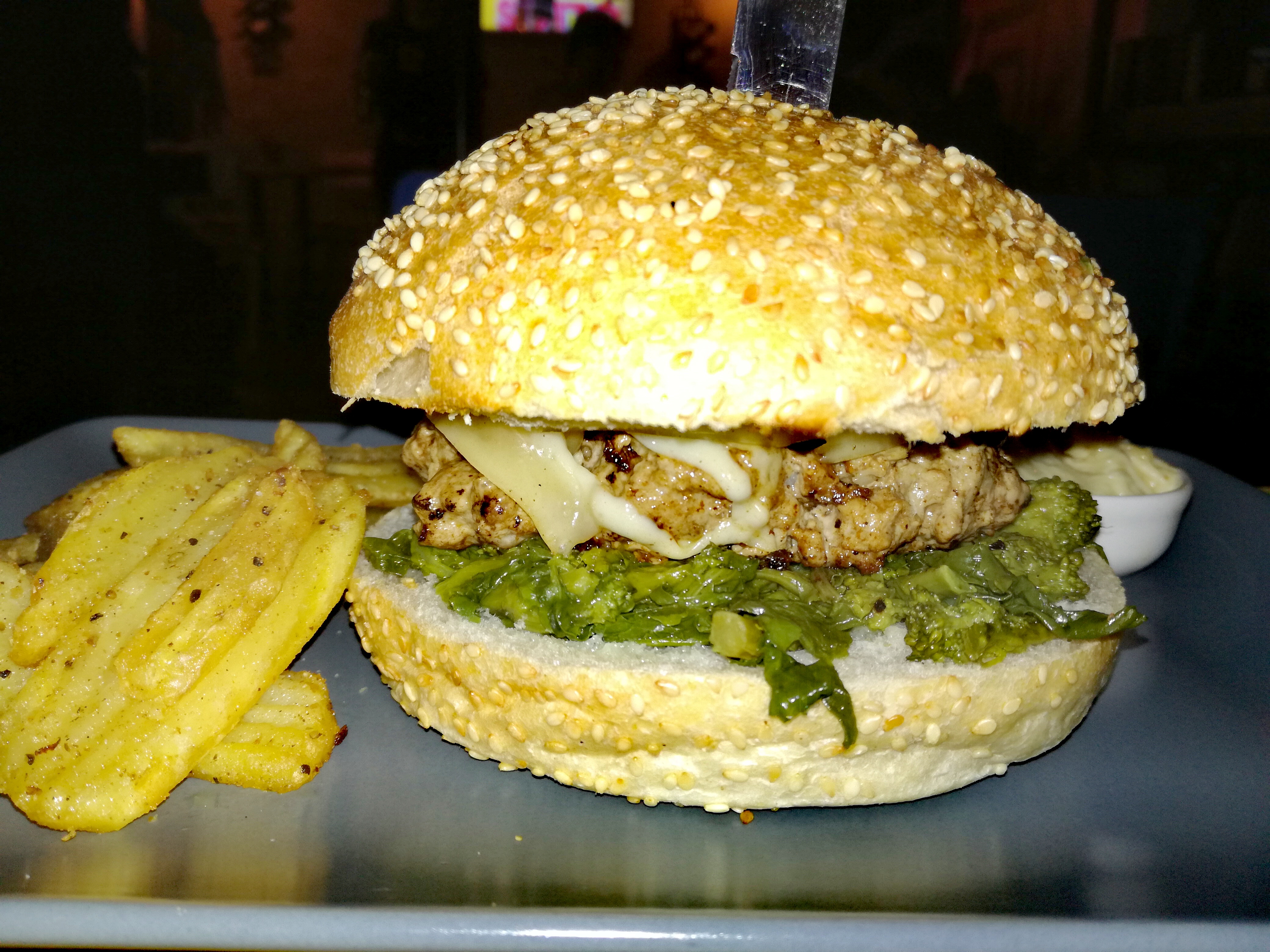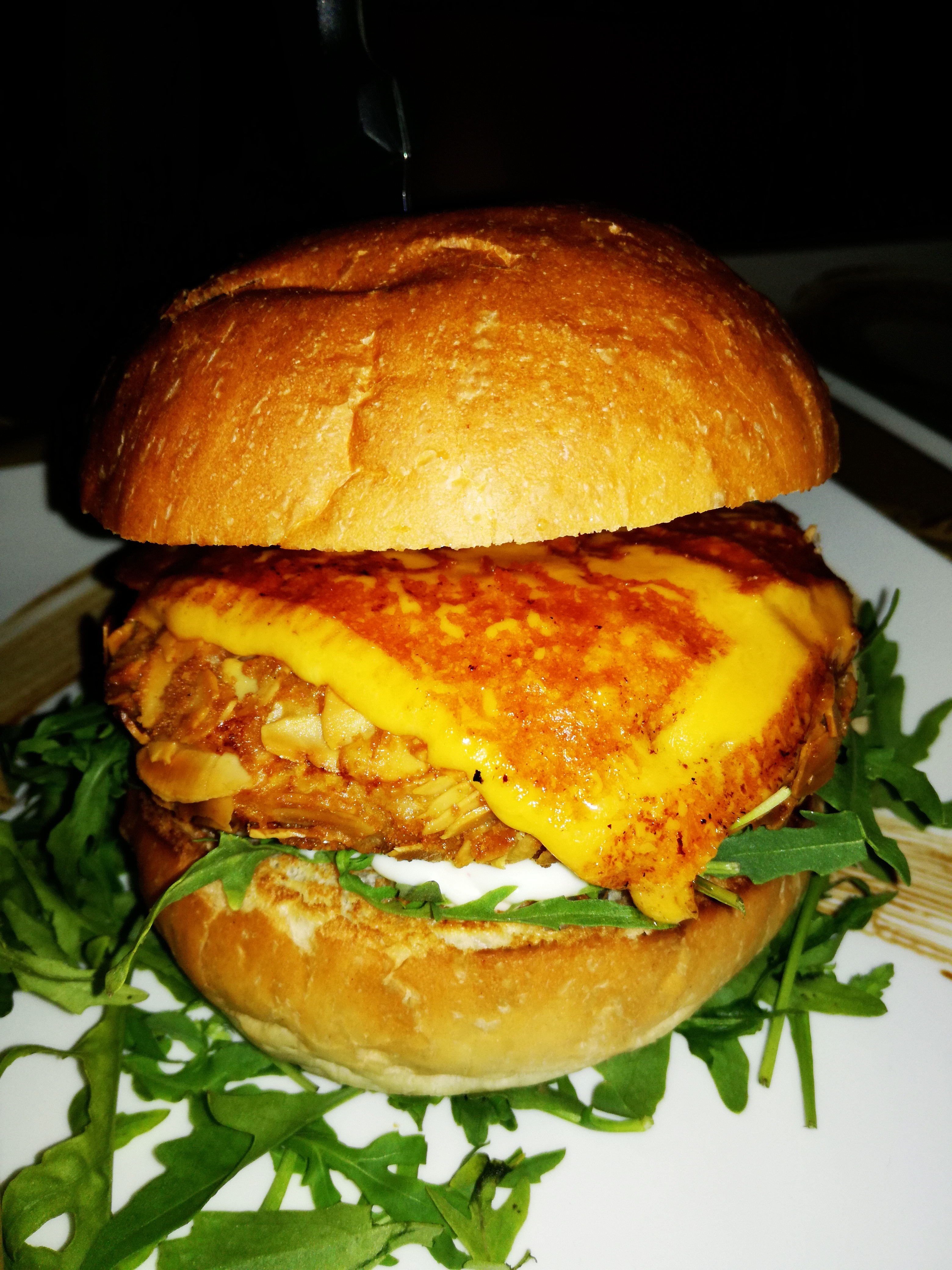 il “Techno” con hamburger di pollo alle mandorle, rucola, provola, cheddar e mayolime.