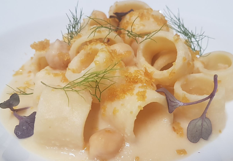 Mare e terra che si incontrano in questo goloso primo piatto dello chef Donatantonio, cuoco dell’Alleanza Slow Food, e non solo, ma anche diversi territori campani passando dalla Costiera Amalfitana al Cilento, sino a toccare l’Avellinese. Nella parte nord-orientale della provincia di Avellino, e in particolare nella Valle dell’Ufita, gli agricoltori si dedicano alla coltivazione dell’aglio. Questo prodotto dal sapore fortemente aromatico, contiene un gran quantitativo di oli essenziali e principi attivi. I ceci di Cicerale in Cilento, a Presidio Slow Food, sono piccoli legumi rotondi, dal colore leggermente più dorato rispetto a quelli comuni, con sfumature nocciola chiaro, e dal sapore intenso. Materia prima ricercata e selezionata, proveniente da agricoltura biologica, per la realizzazione di questa ricetta che sarà presentata il prossimo settembre a Terra Madre Salone del Gusto 2018 al Lingotto Fiera di Torino. Giunta alla dodicesima edizione, è organizzata da Slow Food, Città di Torino e Regione Piemonte, in collaborazione con il Ministero delle Politiche agricole alimentari e forestali e il coinvolgimento del Ministero dei beni e delle attività culturali e del turismo, nell’ambito delle attività previste per l’anno del cibo italiano. Il piatto può essere accostato per gli ingredienti contenuti all’interno e la sua cromia, ad una Natura morta dell’artista Luis Meléndez, nato a Napoli, esponente di spicco della pittura settecentesca in Spagna e Italia, abile interprete della pittura di tradizione e di quella ruotante intorno al Goya.