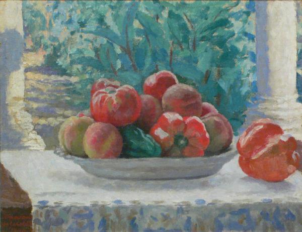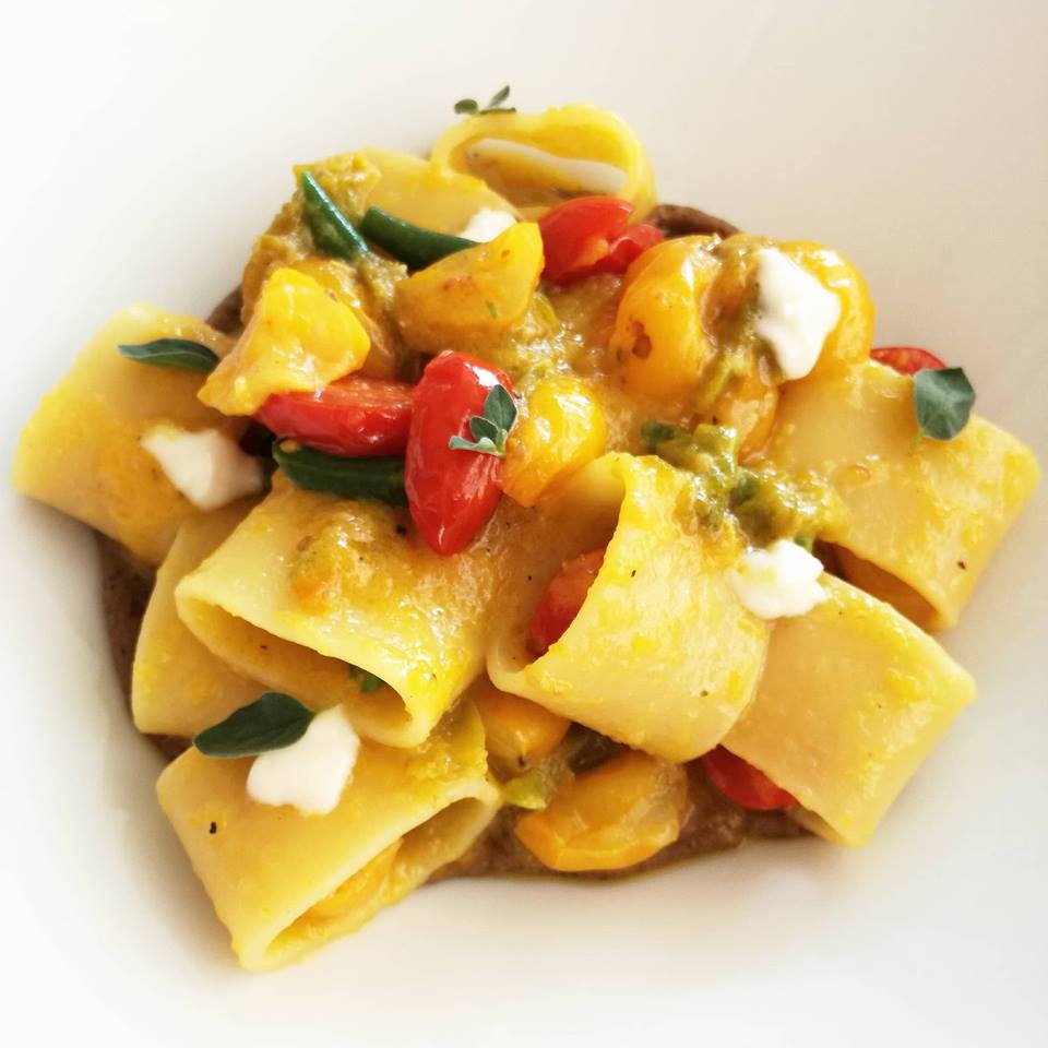 La chef Michela Altieri, protagonista assieme alla conduttrice Maria Rosaria Sica di ben due edizioni del fortunato format televisivo “I Sapori del Sole” su ALICE TV, propone la sua idea di “estate gastronomica”, tutta da gustare. Tante verdure colorate arricchiscono e danno freschezza a questo primo piatto invitante, reso cremoso dalla morbidezza della crescenza, un formaggio a pasta molle non proprio campano ma originario della Lombardia tra l’altro a denominazione PAT. La brillantezza dei colori e le forme geometriche che creano volumetrie e giochi di contrasto grazie allo spessore dei mezzi paccheri, si accostano piacevolmente alla Natura morta con peperoni e pesche del 1930 dell’artista lombardo Bresciani Archimede da Gazoldo (1881-1939), collocata presso il Museo d’Arte Moderna e Contemporanea di Gazoldo degli Ippoliti. La composizione presenta un cesto con pesche e peperoni collocato su di un tavolo coperto da una tovaglia ricamata con fiori azzurri. Sullo sfondo, tra du colonne, si intravedono piante verdi.