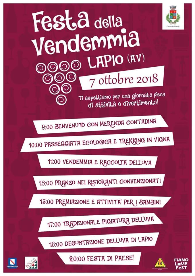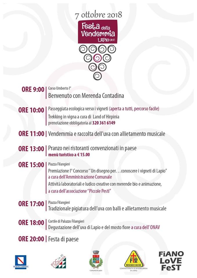 Durante la giornata è possibile usufruire del menù turistico a 15 euro presso i ristoranti convenzionati della zona: Officina del Gusto, Templa Mentis, Fattoria Maria Petrillo, Agriturismo Anila oppure godere degli ottimi aperitivi presso il locale Aperifiano. In pomeriggio, dopo un momento dedicato a compiacere la creatività dei più piccoli con la premiazione del concorso “Un disegno per…conoscere i vigneti di Lapio” si rivive il momento più magico e conviviale della vendemmia, la pigiatura con i piedi al suono di musica e balli folkloristici. A completare la giornata un laboratorio tecnico a cura di Onav Avellino, Organizzazione Nazionale Assaggiatori di Vino, che istruiranno i curiosi all’assaggio del mosto. Alle 20:00, Lapio dà il via alla folkloristica Festa in Paese al ritmo di musica popolare e alla presenza di stand con prodotti tipici della tradizione lapiana.