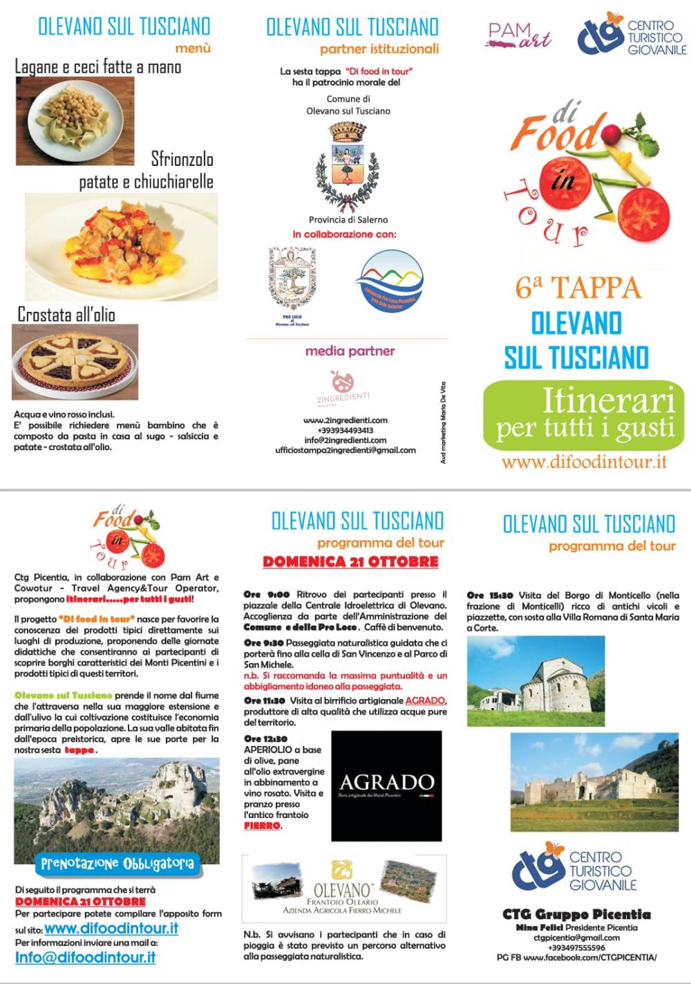 A piccoli passi e in maniera lenta e sostenibile il progetto “Di Food in Tour”, cresciuto a vista d’occhio, domenica 21 ottobre per la sesta volta soddisferà la curiosità e la golosità di tanti salernitani e non che andranno alla scoperta di Olevano sul Tusciano, caratteristico comune dei Picentini. La squadra al femminile composta dalla Dott.ssa Mina Felici Presidente del CTG Gruppo Picentia, dalla Dott.ssa Adele Cavallo Consigliere nazionale CTG, dalla Dott.ssa Annamaria Parlato giornalista enogastronomica e titolare dello Studio PAMart di Consulenza e Progettazione culturale, dalla Dott.ssa Maria de Vita esperta di grafica e marketing territoriale e da Rosa Genovese della Cowotur-Travel Agency&Tour Operator, è già all’opera per trasformare l’idea in un vero e proprio format e quindi non in un’iniziativa sporadica, anche attraverso la formazione degli ACA (accompagnatori culturali ambientali promossi dal CTG Nazionale), che si si porrà come obiettivo quello dell’incoming turistico sia dal punto di vista culturale che enogastronomico nel salernitano, replicabile poi su più territori. Olevano sul Tusciano prende il nome da “Tuscianum”, attribuito dalla popolazione etrusca e facente riferimento alla valle attraversata dal fiume omonimo, e da “Olevano” che deriva dalla estesa e diffusa coltivazione dell’olivo in tutta la zona, di origine greca. Il territorio non presenta un centro urbanizzato, ma tre distinte frazioni (Monticelli, Ariano e Salitto), con un fulcro centrale da cui nei secoli sono dipartiti raggi di espansione che si sono dovuti adattare alle linee collinari, non riuscendo a costituire un unico agglomerato urbano. Nelle tre frazioni ci sono varie opere che meritano di essere visitate. Questa volta l’itinerario ideato grazie al supporto logistico dell’amministrazione comunale presieduta dal Sindaco Michele Volzone, con la collaborazione del neo Assessore alle Attività Culturali Candido Maddalo e del Presidente della Pro Loco Pietro D’Aniello, si articolerà prendendo il via, dopo il classico benvenuto con caffè, dal sentiero montano che porterà verso la Cella di San Vincenzo, un piccolo monastero risalente a prima dell’anno Mille, dipendente dall’Abbazia di San Vincenzo al Volturno. Da qui sarà possibile ammirare le bellezze floristiche e faunistiche, e ci sarà la possibilità di rilassarsi in uno degli spazi verdi attrezzati del Parco di San Michele. A seguire una visita al microbirrificio Agrado dei fratelli Gloriante, sarà d’obbligo per placare la sete con un prodotto di altissima qualità.