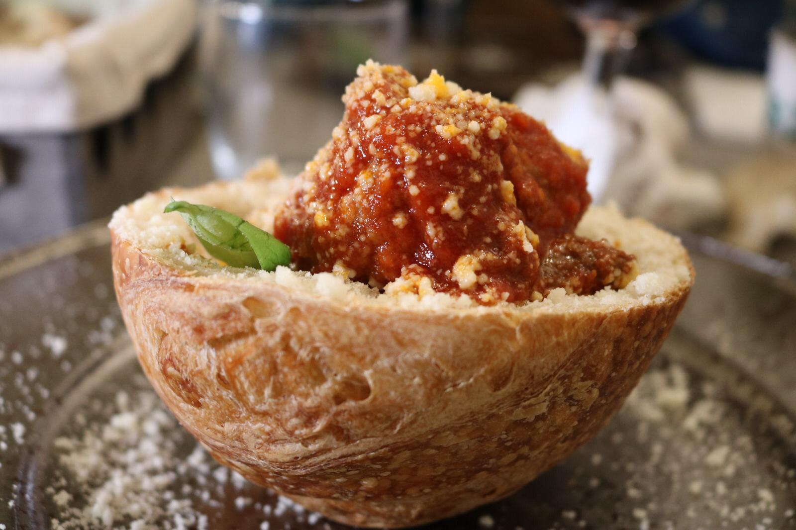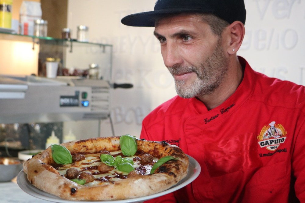 Un sontuoso tortino di melenzane con il ragù colante a mo’ di lava dal Vesuvio, ha preceduto la pizza con le polpettine preparata dal Maestro Pizzaiolo Gaetano Carponi con un impasto di tipo 1 ed alta idratazione.