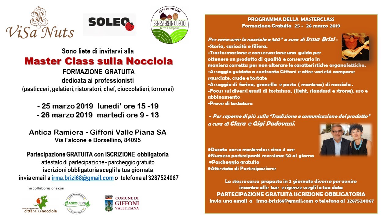 Per questo motivo il 25 e il 26 marzo a Giffoni Valle Piana su iniziativa di Visa Nuts, di Soleo e della rete di imprese Benessere in guscio Terre Campane si terrà un importante appuntamento di formazione gratuita dedicata ai professionisti (pasticceri, gelatieri, ristoratori, chef, cioccolatieri, torronai). La Master Class ha il patrocinio del Comune di Giffoni Valle Piana, di AgroCepi e dell’Associazione Nazionale Città della Nocciola. L’appuntamento è a Giffoni Valle Piana presso L ‘Antica Ramiera nei giorni di lunedì 25 marzo 2019 dalle ore 15,00 alle ore 19,00 e martedì 26 marzo 2019 dalle ore 9,00 alle ore 13,00.