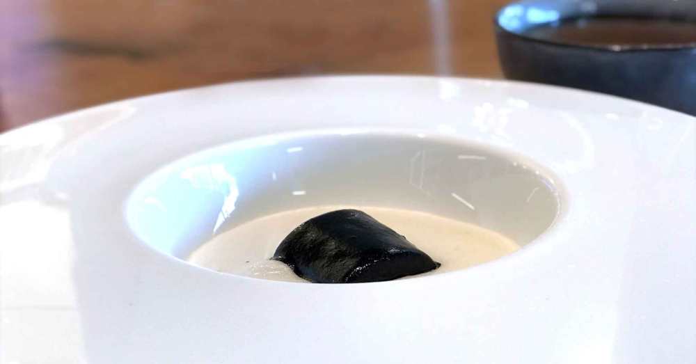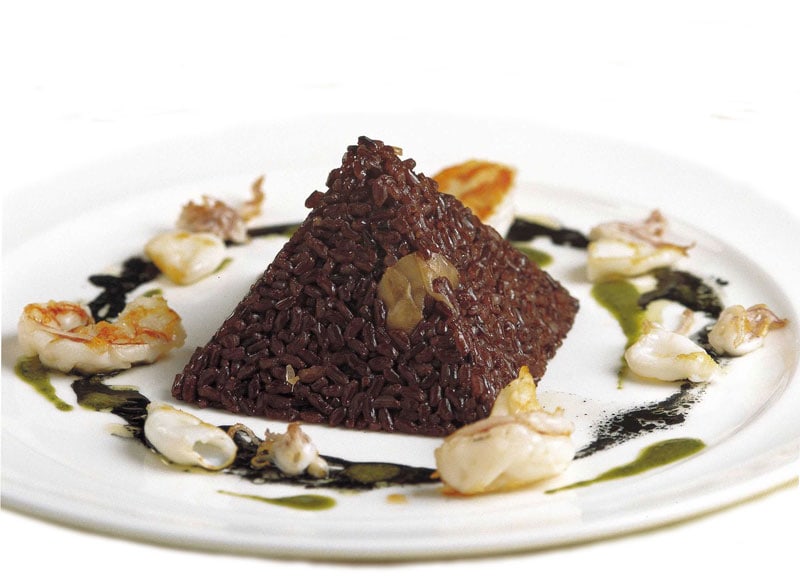 Il piatto è composto da polenta morbida di mais biancoperla a presidio Slow Food, tipica del Veneto, calamaro scottato con il suo nero e brodo di foglie di mais. Elegante, raffinato, il piatto si può racchiudere in questa massima del filosofo e mistico cinese Chuang-tzu: “La tua vita è l’armonia in cui si fondono yin e yang”. “Piramide di Riso Venere” del maestro Gualtiero Marchesi, con riso nero venere assemblato alla maniera di un risotto, condito con soia e zenzero e una corona di gamberi e scampi, è sicuramente la trasposizione gastronomica dell’opera di Giovanni Cavaliere.