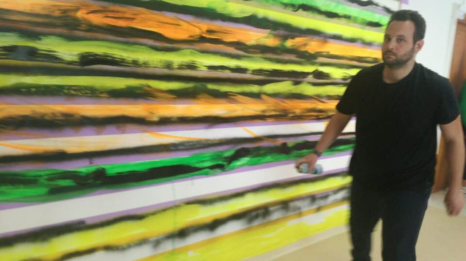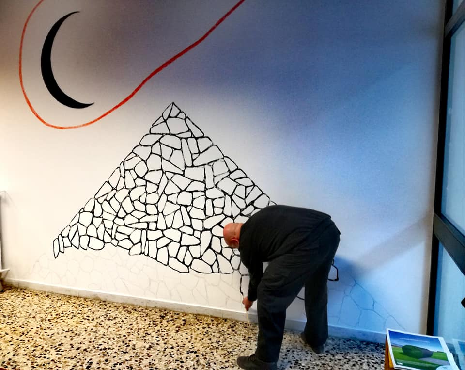 Infine il salernitano Paolo Bini il 19 marzo ha lavorato all’opera “Ipotesi di paesaggio“, utilizzando una particolare tecnica che contraddistingue da sempre i suoi manufatti, ossia l’utilizzo di nastri-carta multicolor sulla parete, misti a pittura. I nastri poi sono stati rimossi e in questo modo i segni astratti, geometrici ed informali sono rimasti sulla parete bianca. Gli studenti hanno potuto poi osservare e aprire un dibattito con l’artista al compimento dell’opera, fruendola e dando vita ad un momento performante collettivo di enorme sensibilità. Paolo Bini si è aggiudicato nel 2016 il prestigioso Premio Cairo.