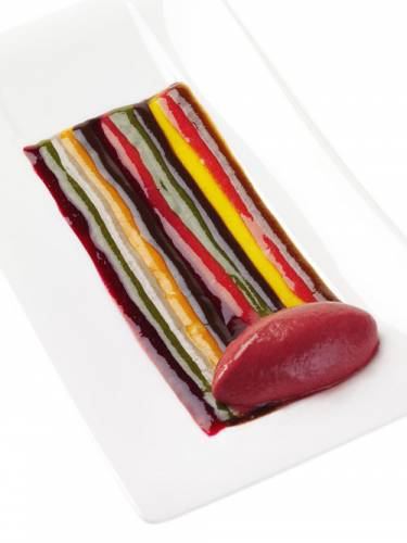 Il piatto, quasi un pre-dessert è composto da un demi-soufflé di parmigiano 24 mesi, da una spuma con parmigiano 30 mesi, da una crema liquida ottenuta da un parmigiano di 36 mesi, da una galletta ottenuta alle croste con stagionatura 40 mesi e infine da un’aria originata da un brodo di croste di parmigiano speciale con 50 mesi di stagionatura. Un’opera d’arte monocroma quella di Bottura a metà tra tradizione e avanguardia. “Salsa che diventa sorbetto e sorbetto che diventa salsa” dello chef Pop Davide Oldani, dessert ideato per il noto marchio a righe Calze Gallo, è vicinissimo all’opera di Bini.