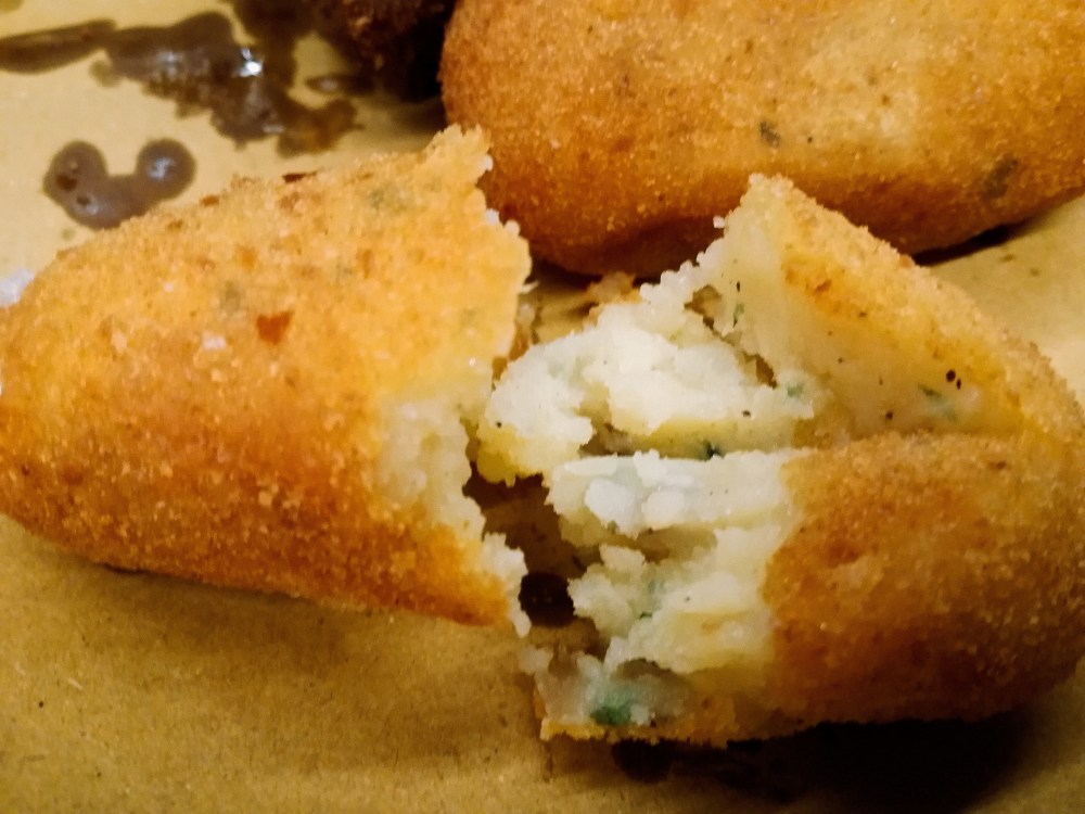 La pizza ha il disco sottile, è scioglievole e leggera, l’impasto contiene farina 0, lievito di birra, sale e acqua. La lievitazione diretta è di 24h a temperatura costante e il cornicione è medio-basso. Finalmente qualcosa di più ricercato e di diverso dal solito canotto. I topping variano dai classici ai sofisticati per gli amanti delle novità. Tutto è selezionato direttamente da Alfonso che preferisce rifornirsi in zona, possibilmente a pochissimi chilometri dalla pizzeria che è ubicata sulla SS18 che porta a Bellizzi, dopo il Centro Commerciale Maximall di Pontecagnano. I latticini ad esempio provengono dal Caseificio Ilka di Carlo Pipolo e altri nuovi prodotti saranno presto introdotti da Alfonso nel suo menù. In assaggio prima delle pizze un crocchè e una mozzarella in carrozza. Spettacolari entrambi, ben eseguiti, croccanti e con un bel ripieno appagante. L’artefice di questi capolavori color oro è Vincenzo Senatore, braccio destro di Alfonso, il re del fritto napoletano, e non solo, ma anche dei dolci artigianali che regalano un fine pasto carico di emozioni.