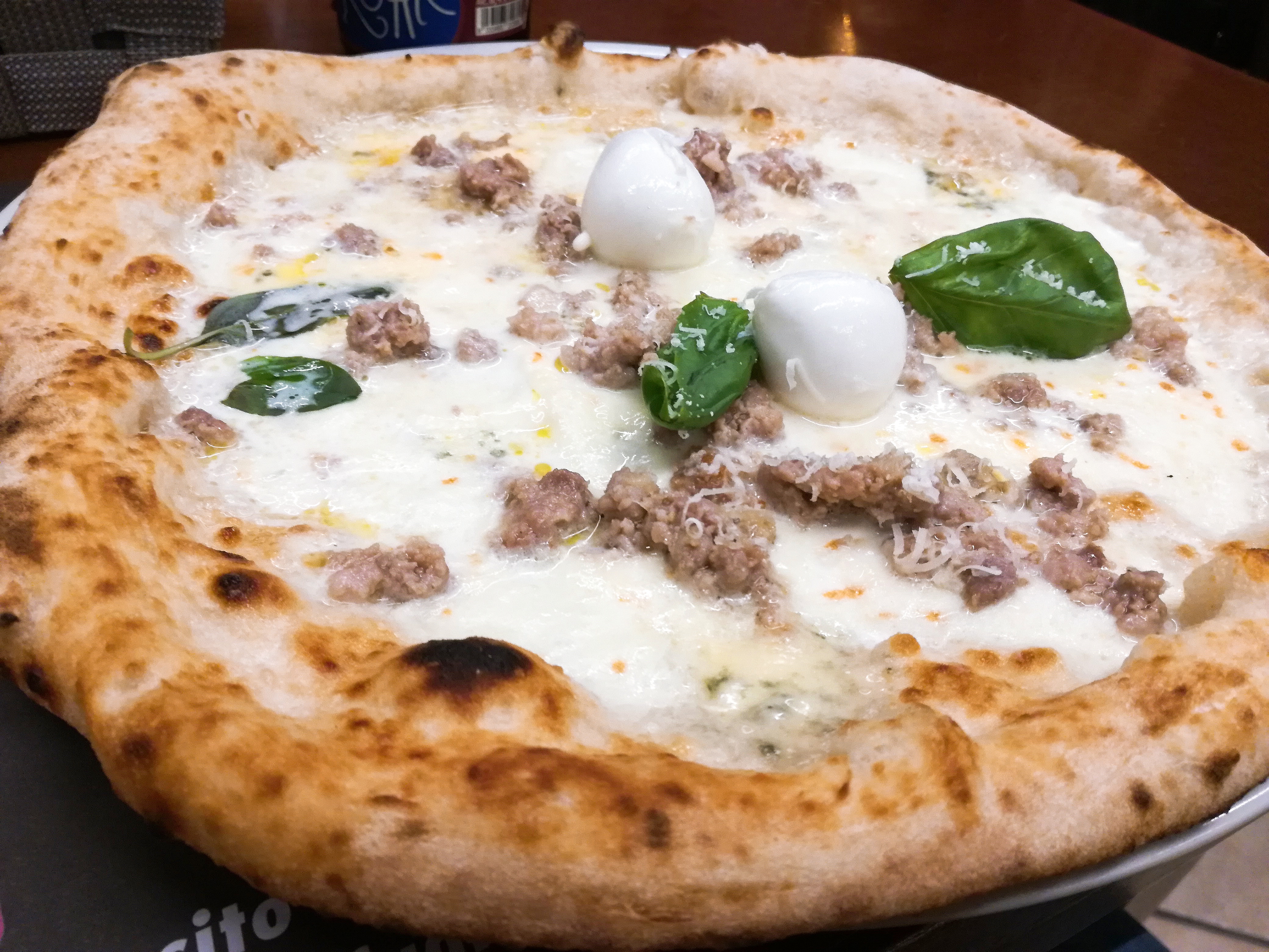 Ecco le pizze: una Napul’E’ con scaglie di pecorino carmasciano, pomodoro San Marzano, basilico e olio extravergine d’oliva salernitano, un tuffo nel passato quando anticamente a Napoli si usava quella spolverata di formaggio per condire la pizza e una quattro formaggi con aggiunta personalizzata di ciliegine di bufala e salsiccia e insaporita da cacioricotta cilentano, mozzarella di bufala, provola affumicata e blue di jersey dolce. Indescrivibile, unica, pazzesca.